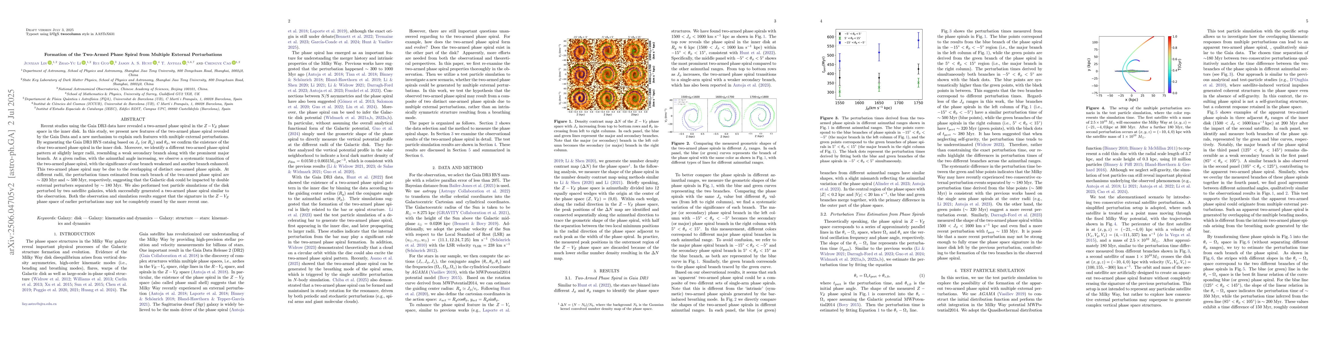 Recent studies using the Gaia DR3 data have revealed a two-armed phase spiral in the $Z-V_Z$ phase space in the inner disk. In this study, we present new features of the two-armed phase spiral revealed by the Gaia Data and a new mechanism to explain such features with multiple external perturbations. By segmenting the Gaia DR3 RVS catalog based on $J_{\phi}$ (or $R_{g}$) and $\theta_\phi$, we confirm the existence of the clear two-armed phase spiral in the inner disk. Moreover, we identify a different two-armed phase spiral pattern at slightly larger radii, resembling a weak secondary branch along with the prominent major branch. At a given radius, with the azimuthal angle increasing, we observe a systematic transition of the two-armed phase spiral, with the significance of one branch weakened and another branch enhanced. This two-armed phase spiral may be due to the overlapping of distinct one-armed phase spirals. At different radii, the perturbation times estimated from each branch of the two-armed phase spiral are $\sim 320$ Myr and $\sim 500$ Myr, respectively, suggesting that the Galactic disk could be impacted by double external perturbers separated by $\sim 180$ Myr. We also performed test particle simulations of the disk perturbed by two satellite galaxies, which successfully generated a two-armed phase spiral similar to the observation. Both the observation and simulation results suggest that the signature in the $Z-V_Z$ phase space of earlier perturbations may not be completely erased by the more recent one.