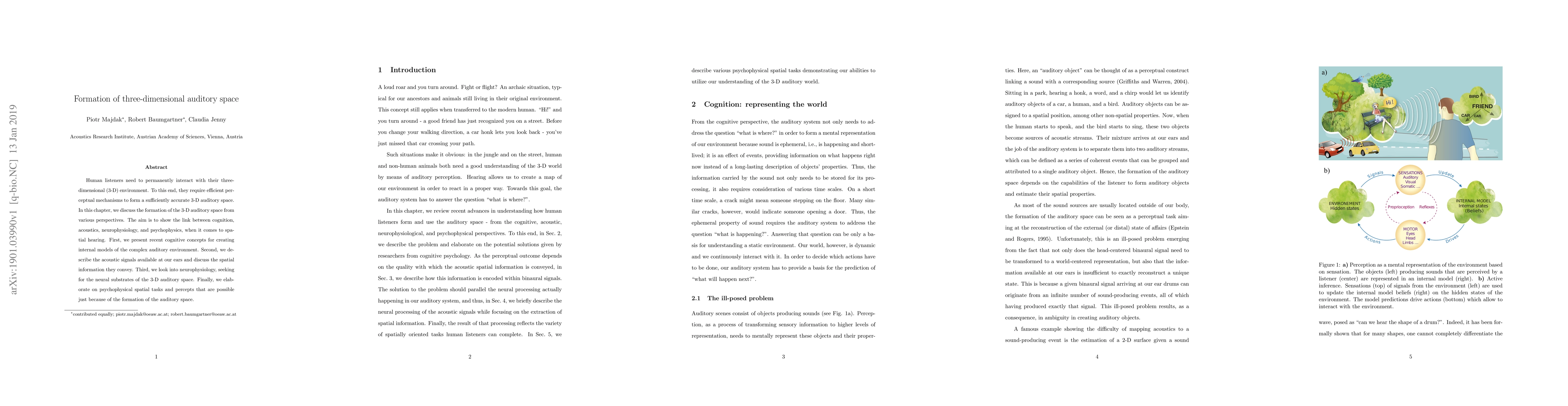 Human listeners need to permanently interact with their three-dimensional (3-D) environment. To this end, they require efficient perceptual mechanisms to form a sufficiently accurate 3-D auditory space. In this chapter, we discuss the formation of the 3-D auditory space from various perspectives. The aim is to show the link between cognition, acoustics, neurophysiology, and psychophysics, when it comes to spatial hearing. First, we present recent cognitive concepts for creating internal models of the complex auditory environment. Second, we describe the acoustic signals available at our ears and discuss the spatial information they convey. Third, we look into neurophysiology, seeking for the neural substrates of the 3-D auditory space. Finally, we elaborate on psychophysical spatial tasks and percepts that are possible just because of the formation of the auditory space.