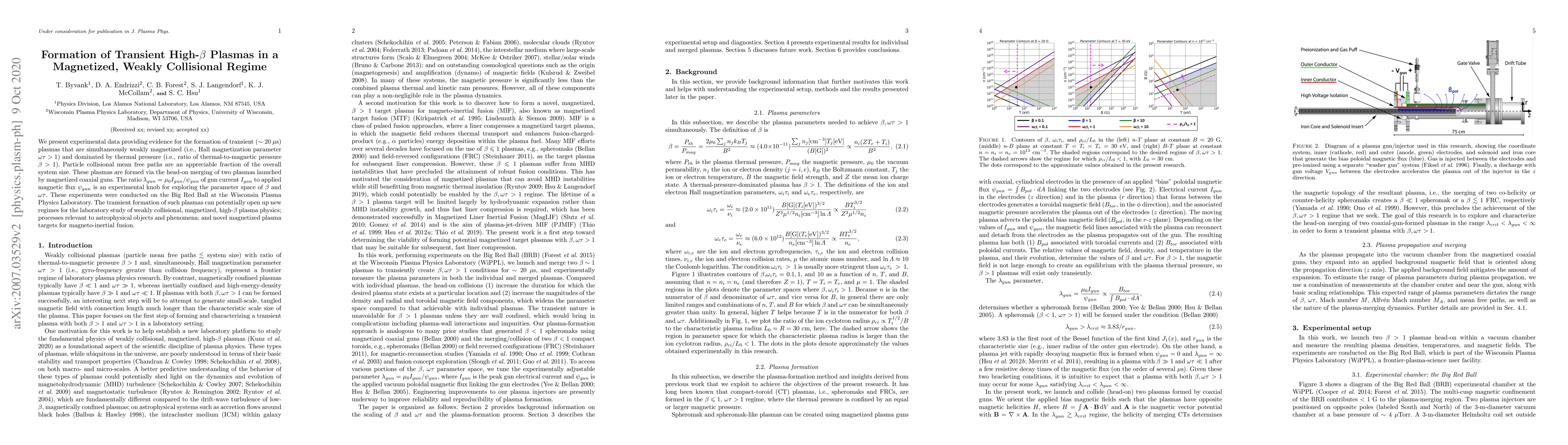 This paper reports experimental evidence for transient high-$\beta$ plasmas formed by merging two weakly magnetized plasmas, characterized by thermal pressure dominance and collisional mean free paths comparable to system size. The study explores the parameter space using the ratio of gun current to magnetic flux, conducted at the Wisconsin Plasma Physics Laboratory.