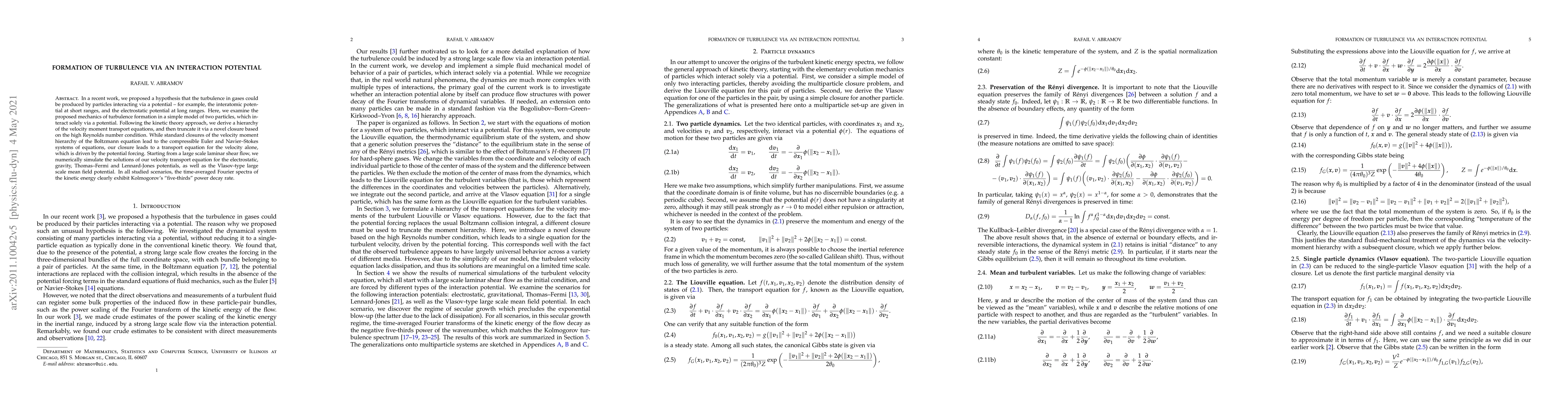 This paper proposes that turbulence in gases can arise from particle interactions via potentials, such as interatomic or electrostatic forces. It develops a novel closure method to derive a transport equation driven by potential forcing, which successfully simulates turbulence formation and exhibits Kolmogorov's "five-thirds" power decay in kinetic energy spectra.