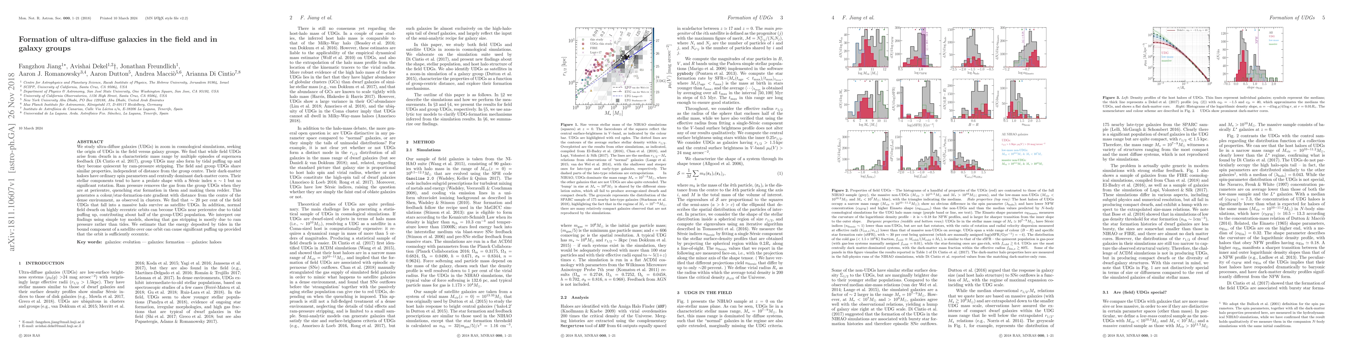 This research uses cosmological simulations to study ultra-diffuse galaxies (UDGs) in field and group environments. It finds that field UDGs form from dwarfs with supernova feedback, while group UDGs result from tidal stripping and ram-pressure quenching. Both types share similar dark-matter halo properties, stellar shapes, and lack significant rotation. About 20% of field UDGs survive as satellites, and eccentric orbits can transform field dwarfs into UDGs via tidal puffing up, contributing to group UDG populations. The study suggests ram pressure is the primary cause of gas removal and stripping in group UDGs.