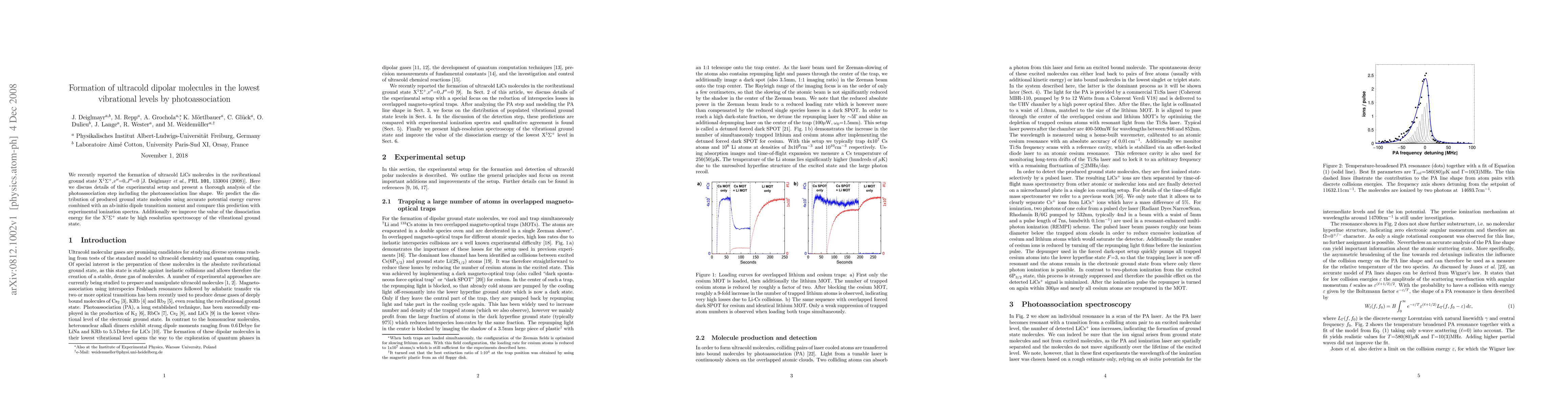 This paper details the experimental formation of ultracold LiCs dipolar molecules in their rovibrational ground state, focusing on the photoassociation process and its line shape. The authors predict the distribution of ground state molecules using potential energy curves and compare it with ionization spectra, while also refining the dissociation energy through high-resolution spectroscopy.