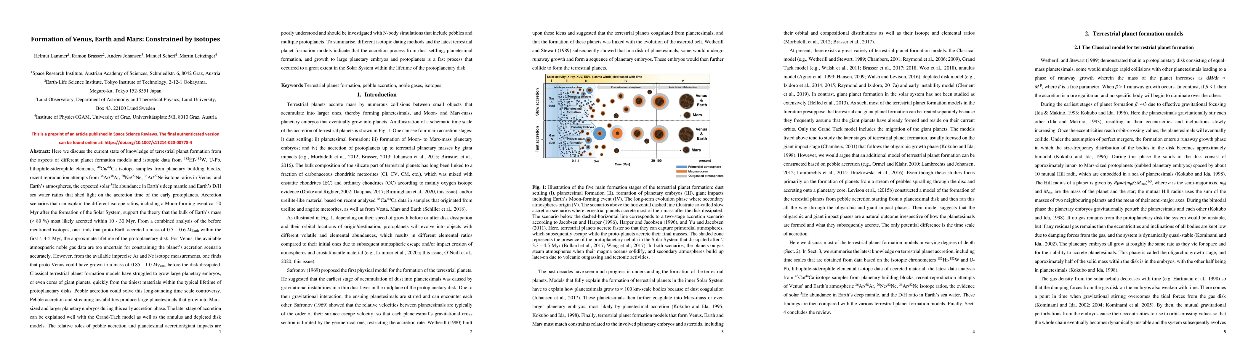 This paper examines terrestrial planet formation models, using isotopic data to constrain the formation of Venus, Earth, and Mars. It finds that Earth likely accreted most of its mass within 10-30 Myr, while Venus may have reached 0.85-1.0 times its current mass before the protoplanetary disk dissipated. Pebble accretion is proposed as a solution to the rapid growth of planetary embryos.