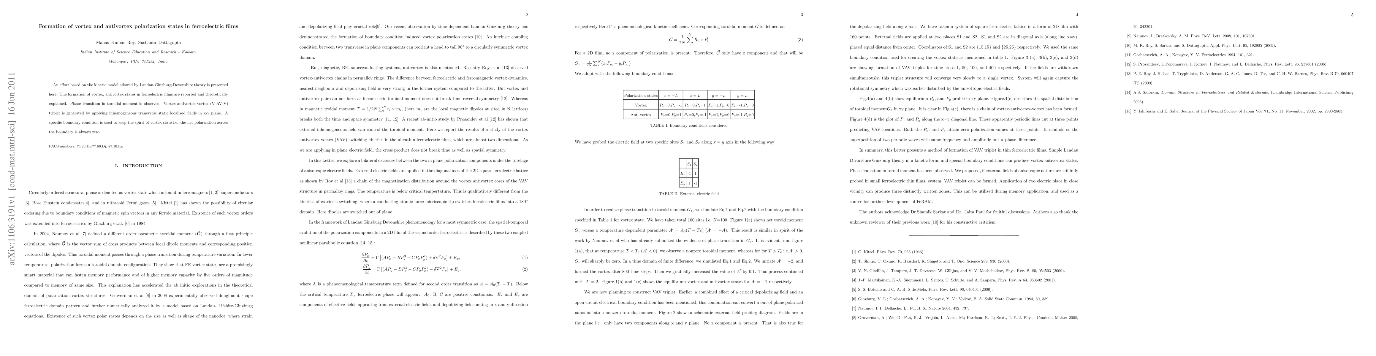 An effort based on the kinetic model allowed by Landau-Ginzburg-Devonshire theory is presented here. The formation of vortex, antivortex states in ferroelectric films are reported and theoretically explained. Phase transition in toroidal moment is observed. Vortex-antivortex-vortex (V-AV-V) triplet is generated by applying inhomogeneous transverse static localized fields in x-y plane. A specific boundary condition is used to keep the spirit of vortex state i.e. the net polarization across the boundary is always zero. %This is neither a periodic nor an open circuit electric boundary condition.