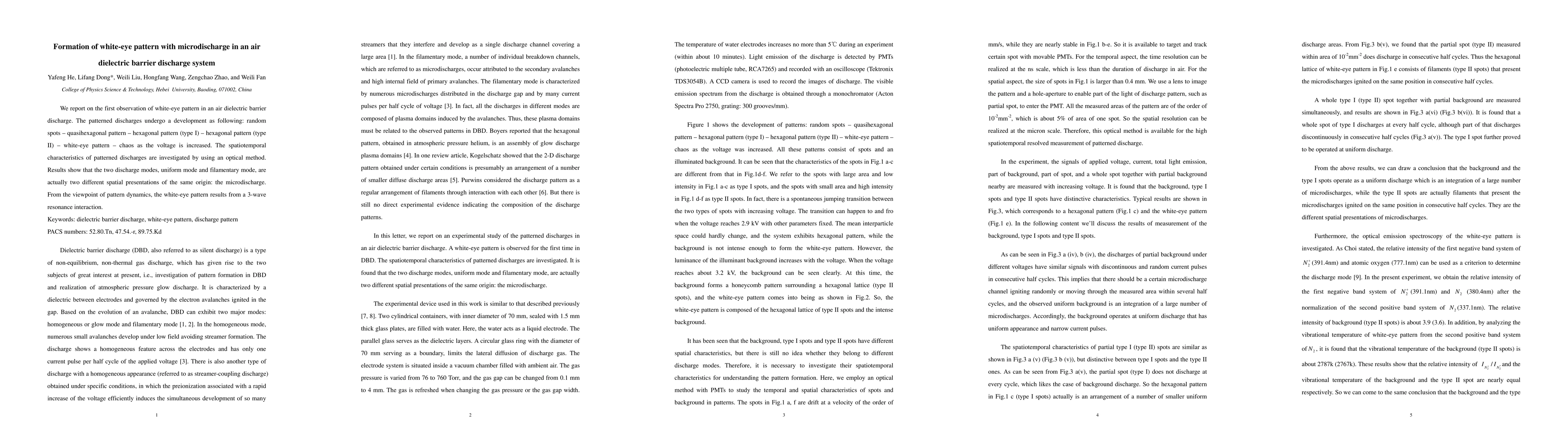 Researchers observed a new phenomenon called white-eye pattern in an air dielectric barrier discharge system, which develops through multiple stages including random spots and hexagonal patterns.