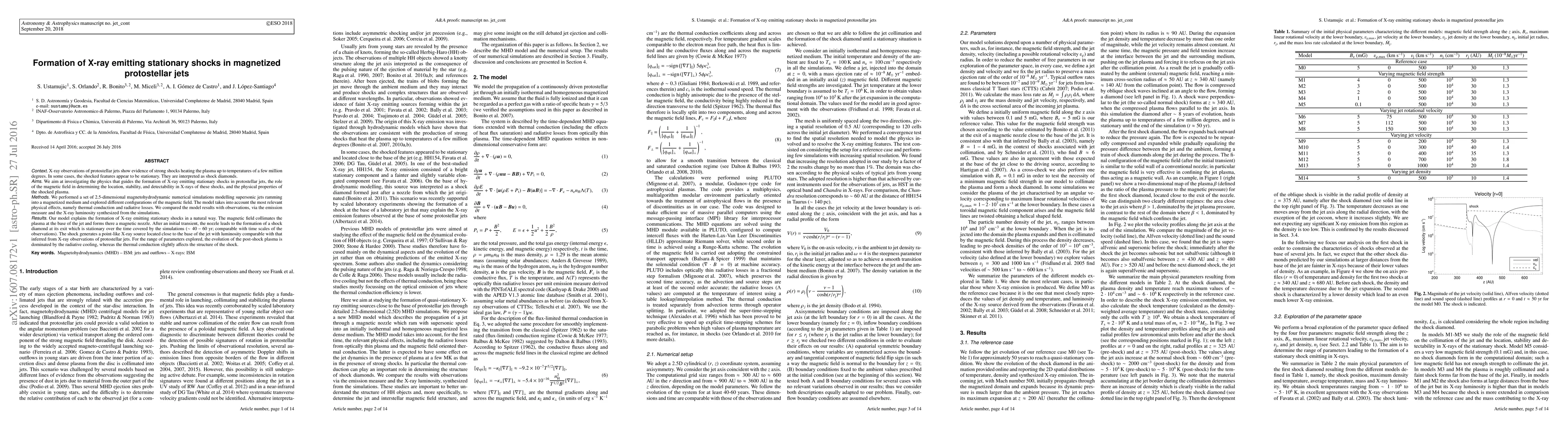 X-ray observations of protostellar jets show evidence of strong shocks heating the plasma up to temperatures of a few million degrees. In some cases, the shocked features appear to be stationary. They are interpreted as shock diamonds. We aim at investigating the physics that guides the formation of X-ray emitting stationary shocks in protostellar jets, the role of the magnetic field in determining the location, stability, and detectability in X-rays of these shocks, and the physical properties of the shocked plasma. We performed a set of 2.5-dimensional magnetohydrodynamic numerical simulations modelling supersonic jets ramming into a magnetized medium and explored different configurations of the magnetic field. The model takes into account the most relevant physical effects, namely thermal conduction and radiative losses. We compared the model results with observations, via the emission measure and the X-ray luminosity synthesized from the simulations. Our model explains the formation of X-ray emitting stationary shocks in a natural way. The magnetic field collimates the plasma at the base of the jet and forms there a magnetic nozzle. After an initial transient, the nozzle leads to the formation of a shock diamond at its exit which is stationary over the time covered by the simulations (~ 40 - 60 yr; comparable with time scales of the observations). The shock generates a point-like X-ray source located close to the base of the jet with luminosity comparable with that inferred from X-ray observations of protostellar jets. For the range of parameters explored, the evolution of the post-shock plasma is dominated by the radiative cooling, whereas the thermal conduction slightly affects the structure of the shock.