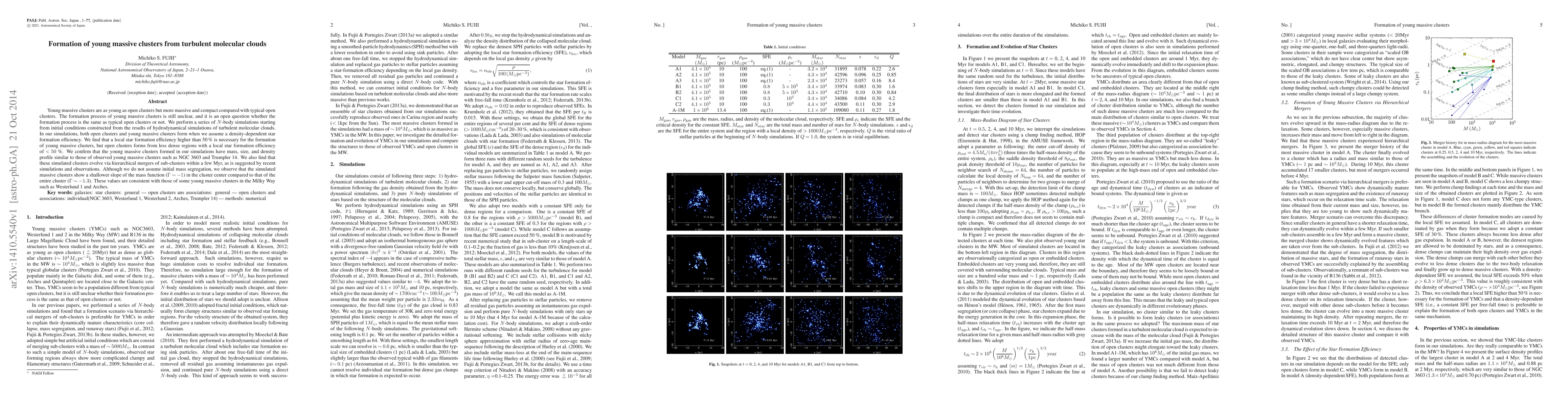 This paper investigates the formation of young massive clusters through $N$-body simulations based on turbulent molecular clouds. It finds that a star formation efficiency above 50% is necessary for their formation, contrasting with open clusters formed in less dense regions. The simulated clusters match observed characteristics and evolve via sub-cluster mergers.