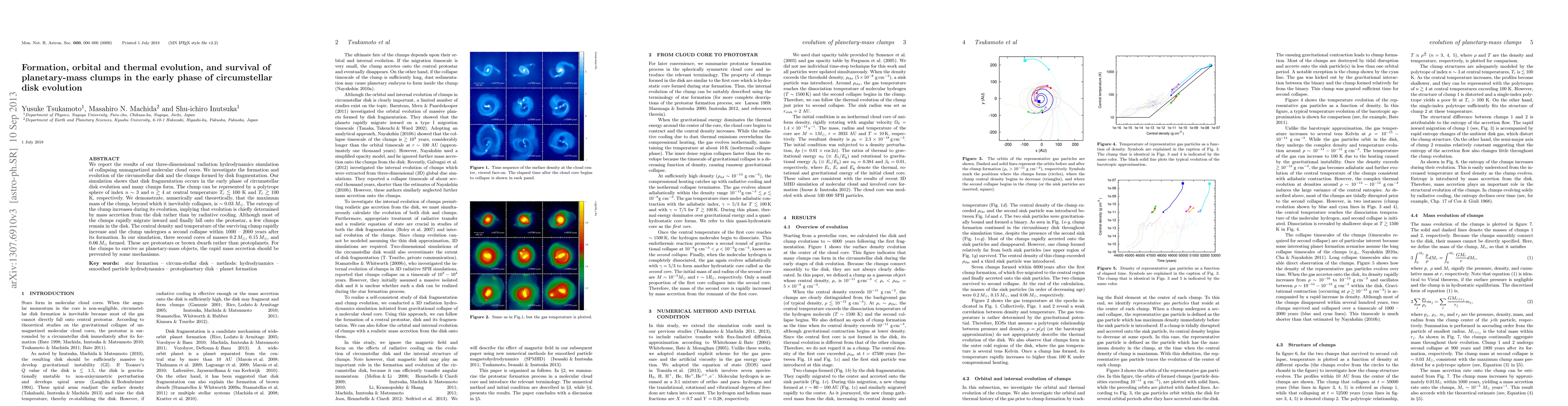 We report the results of our three-dimensional radiation hydrodynamics simulation of collapsing unmagnetized molecular cloud cores. We investigate the formation and evolution of the circumstellar disk and the clumps formed by disk fragmentation. Our simulation shows that disk fragmentation occurs in the early phase of circumstellar disk evolution and many clumps form. The clump can be represented by a polytrope sphere of index $n \sim 3$ and $n \gtrsim 4$ at central temperature $T_c \lesssim100$ K and $T_c \gtrsim 100$ K, respectively. We demonstrate, numerically and theoretically, that the maximum mass of the clump, beyond which it inevitably collapses, is $\sim 0.03 M_{\odot}$. The entropy of the clump increases during its evolution, implying that evolution is chiefly determined by mass accretion from the disk rather than by radiative cooling. Although most of the clumps rapidly migrate inward and finally fall onto the protostar, a few clumps remain in the disk. The central density and temperature of the surviving clump rapidly increase and the clump undergoes a second collapse within 1000 - 2000 years after its formation. In our simulation, three second cores of masses $0.2\msun$, $0.15\msun$, and $0.06\msun$ formed. These are protostars or brown dwarfs rather than protoplanets. For the clumps to survive as planetary-mass objects, the rapid mass accretion should be prevented by some mechanisms.