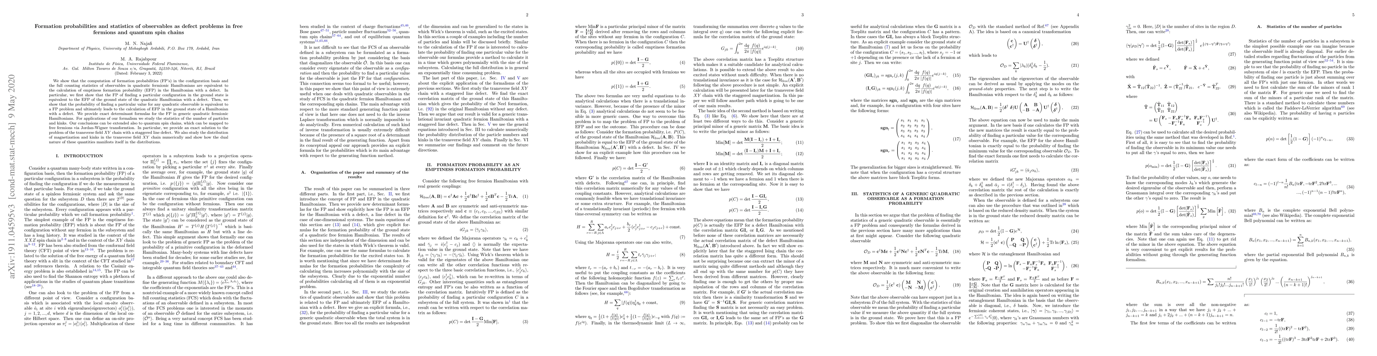 This paper demonstrates that formation probabilities and full counting statistics in quadratic fermionic Hamiltonians are equivalent to calculating emptiness formation probabilities in Hamiltonians with defects. It provides exact determinant formulas for these probabilities and applies the formalism to study particle and kink statistics in quantum spin chains, including the transverse field XY chain with a defect.