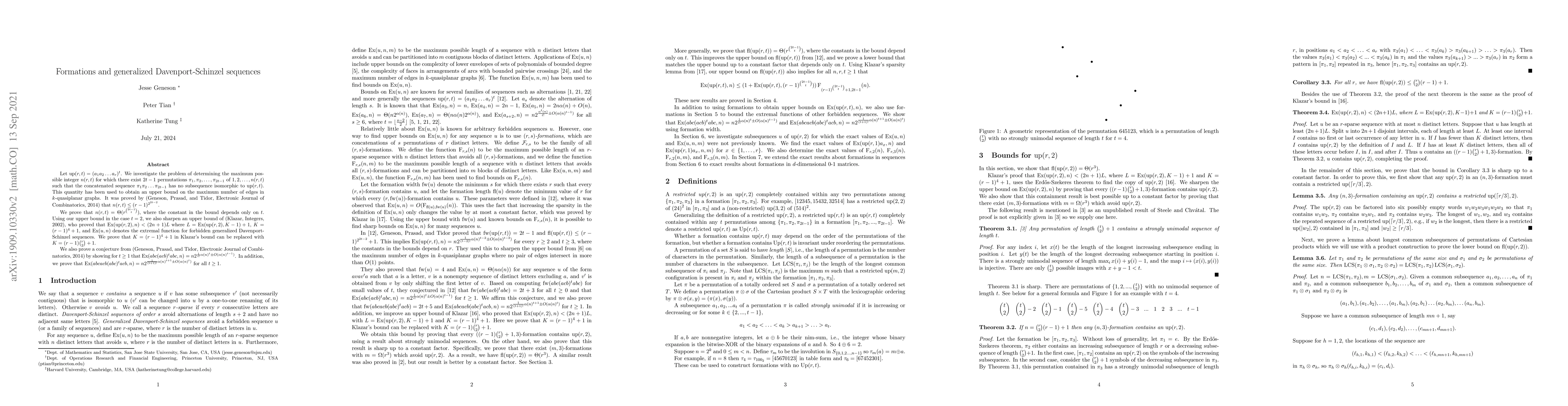 Let $up(r, t) = (a_1 a_2 \dots a_r)^t$. We investigate the problem of determining the maximum possible integer $n(r, t)$ for which there exist $2t-1$ permutations $\pi_1, \pi_2, \dots, \pi_{2t-1}$ of $1, 2, \dots, n(r, t)$ such that the concatenated sequence $\pi_1 \pi_2 \dots \pi_{2t-1}$ has no subsequence isomorphic to $up(r,t)$. This quantity has been used to obtain an upper bound on the maximum number of edges in $k$-quasiplanar graphs. It was proved by (Geneson, Prasad, and Tidor, Electronic Journal of Combinatorics, 2014) that $n(r, t) \le (r-1)^{2^{2t-2}}$. We prove that $n(r,t) = \Theta(r^{2t-1 \choose t})$, where the constant in the bound depends only on $t$. Using our upper bound in the case $t = 2$, we also sharpen an upper bound of (Klazar, Integers, 2002), who proved that $Ex(up(r,2),n) < (2n+1)L$ where $L = Ex(up(r,2),K-1)+1$, $K = (r-1)^4 + 1$, and $Ex(u, n)$ denotes the extremal function for forbidden generalized Davenport-Schinzel sequences. We prove that $K = (r-1)^4 + 1$ in Klazar's bound can be replaced with $K = (r-1) \binom{r}{2}+1$. We also prove a conjecture from (Geneson, Prasad, and Tidor, Electronic Journal of Combinatorics, 2014) by showing for $t \geq 1$ that $Ex(a b c (a c b)^{t} a b c, n) = n 2^{\frac{1}{t!}\alpha(n)^{t} \pm O(\alpha(n)^{t-1})}$. In addition, we prove that $Ex(a b c a c b (a b c)^{t} a c b, n) = n 2^{\frac{1}{(t+1)!}\alpha(n)^{t+1} \pm O(\alpha(n)^{t})}$ for all $t \geq 1$.