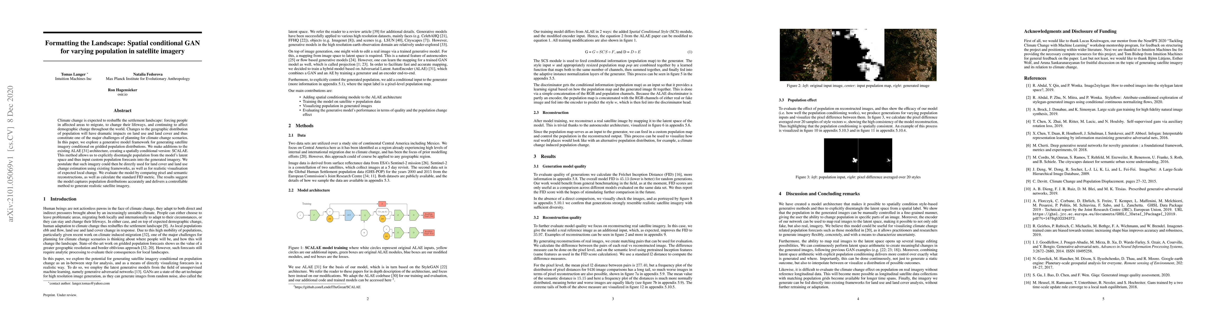 Climate change is expected to reshuffle the settlement landscape: forcing people in affected areas to migrate, to change their lifeways, and continuing to affect demographic change throughout the world. Changes to the geographic distribution of population will have dramatic impacts on land use and land cover and thus constitute one of the major challenges of planning for climate change scenarios. In this paper, we explore a generative model framework for generating satellite imagery conditional on gridded population distributions. We make additions to the existing ALAE architecture, creating a spatially conditional version: SCALAE. This method allows us to explicitly disentangle population from the model's latent space and thus input custom population forecasts into the generated imagery. We postulate that such imagery could then be directly used for land cover and land use change estimation using existing frameworks, as well as for realistic visualisation of expected local change. We evaluate the model by comparing pixel and semantic reconstructions, as well as calculate the standard FID metric. The results suggest the model captures population distributions accurately and delivers a controllable method to generate realistic satellite imagery.