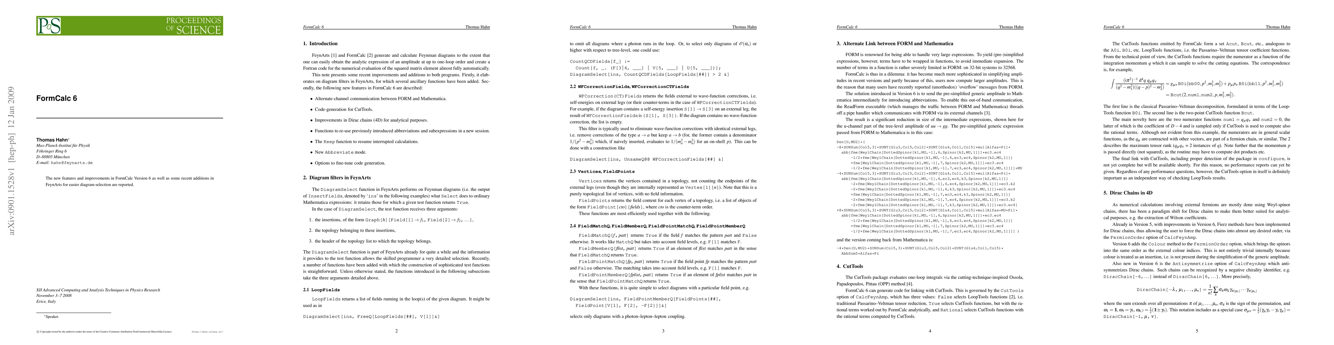 Summary: FormCalc Version 6 introduces new features and enhancements, while FeynArts has added tools for more convenient diagram selection, improving computational efficiency in theoretical physics calculations.
