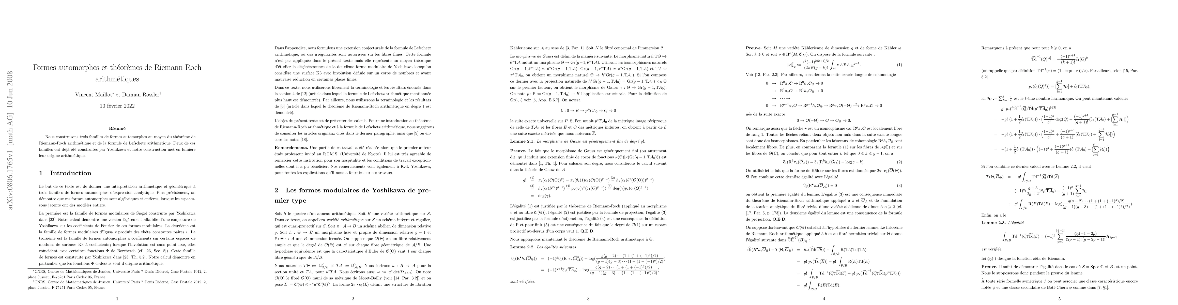 Nous construisons trois familles de formes automorphes au moyen du theoreme de Riemann-Roch arithmetique et de la formule de Lefschetz arithmetique. Deux de ces familles ont deja ete construites par Yoshikawa et notre construction met en lumiere leur origine arithmetique. ----- We construct three families of automorphic forms following the arithmetic Riemann-Roch theorem and the arithmetic Lefschetz formula. Two of these families were already constructed by Yoshikawa and our construction illuminates their arithmetic origin.
