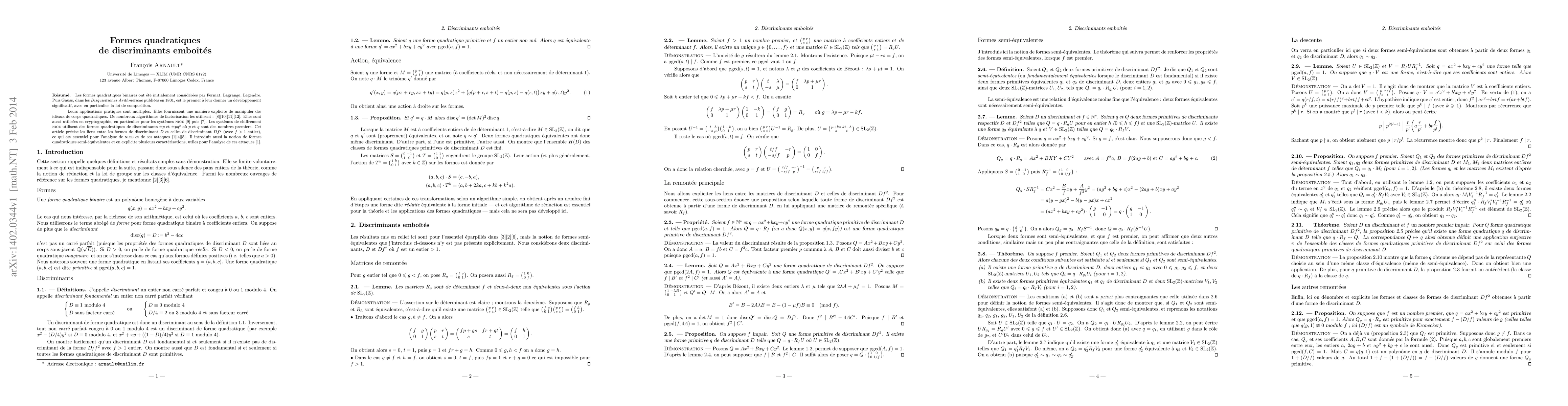 Quadratic forms with embedded discriminants. Integral binary quadratic forms have multiple applications, for example in factorization or cryptography. The Nice family of cryptographic systems makes use of quadratic forms with different discriminants $\pm p$, and $\pm pq^2$ where $p$, $q$ are large primes. This paper shows the precise links between forms with $D$ discriminant and forms with $Df^2$ discriminant, which are crucial in the analysis of the systems Nice and theirs attacks. We also introduce the notion of semi-equivalence of binary quadratic forms, and give some characterizations of semi-equivalent forms, which are useful in the analysis of these attacks. ----- Les formes quadratiques binaires fournissent un moyen explicite pour manipuler des id\'eaux de corps quadratiques, et leurs applications pratiques sont multiples. De nombreux algorithmes de factorisation les utilisent. Elle sont aussi utilis\'ees en cryptographie, en particulier pour les syst\`emes Nice. Les syst\`emes de chiffrement Nice utilisent des formes quadratiques de discriminants $\pm p$ et $\pm pq^2$ o\`u $p$ et $q$ sont des nombres premiers. Cet article pr\'ecise les liens entre les formes de discriminant $D$ et celles de discriminant $Df^2$, ce qui est essentiel pour l'analyse de Nice et de ses attaques. Il introduit aussi la notion de formes quadratiques semi-\'equivalentes et en explicite plusieurs caract\'erisations, utiles pour l'analyse de ces attaques.