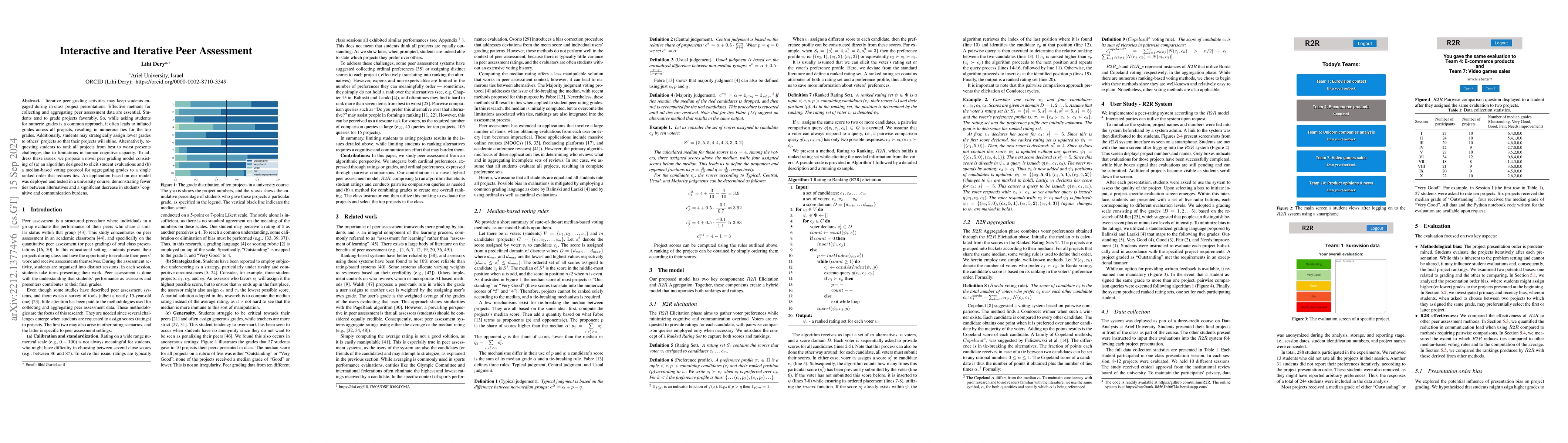 In higher education courses, peer assessment activities are common for keeping students engaged during presentations. Defining precisely how students assess the work of others requires careful consideration. Asking the student for numeric grades is the most common method. However, students tend to assign high grades to most projects. Aggregating peer assessments, therefore, results in all projects receiving the same grade. Moreover, students might strategically assign low grades to the projects of others so that their projects will shine. Asking students to order all projects from best to worst imposes a high cognitive load on them, as studies have shown that people find it difficult to order more than a handful of items. To address these issues, we propose a novel peer rating model consisting of (a) an algorithm that elicits student assessments and (b) a protocol for aggregating grades to produce a single order. The algorithm asks students to evaluate projects and answer pairwise comparison queries. These are then aggregated into a ranking over the projects. An application based on our model was deployed and tested in a university course and showed promising results, including fewer ties between alternatives and a significant reduction in the communication load on students. These results indicate that the model provides a simple, accurate, and efficient approach to peer review.