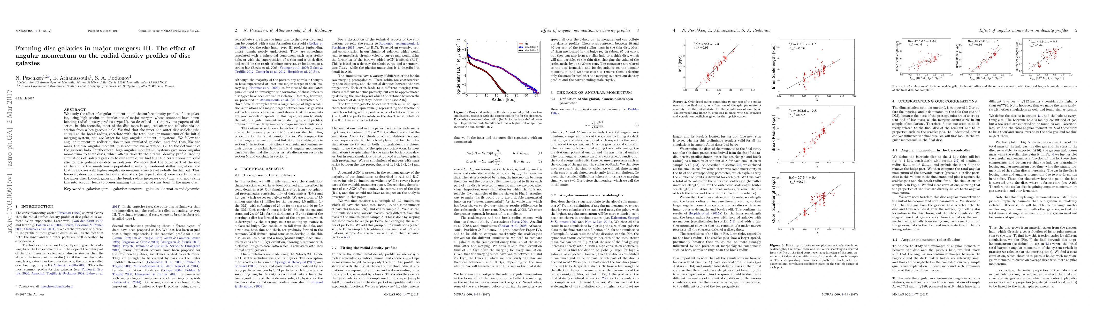 This study investigates how angular momentum influences the radial density profiles of disc galaxies formed in major mergers, finding that higher angular momentum systems correlate with larger disc scalelengths and break radii. The research shows that disc angular momentum is primarily acquired through accretion, affecting the galaxies' density profiles and causing stars to migrate outward more in high angular momentum systems.