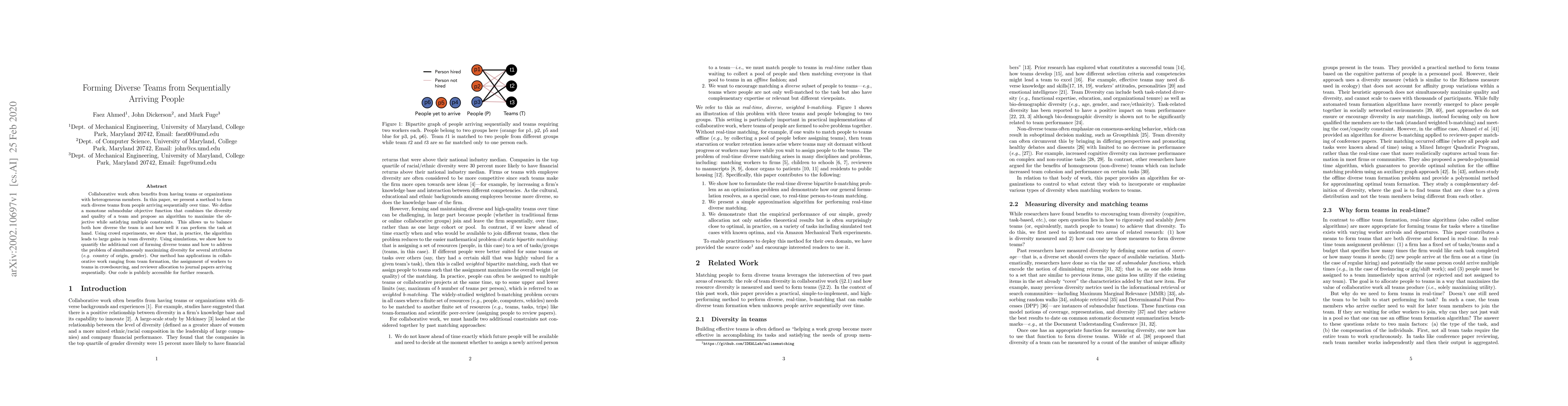 This paper introduces a method to form diverse teams from people arriving over time, using a submodular objective function to balance diversity and performance. Experiments show significant gains in team diversity, while simulations quantify the cost of diversity. Applications range from collaborative work to crowdsourcing and peer review allocation.