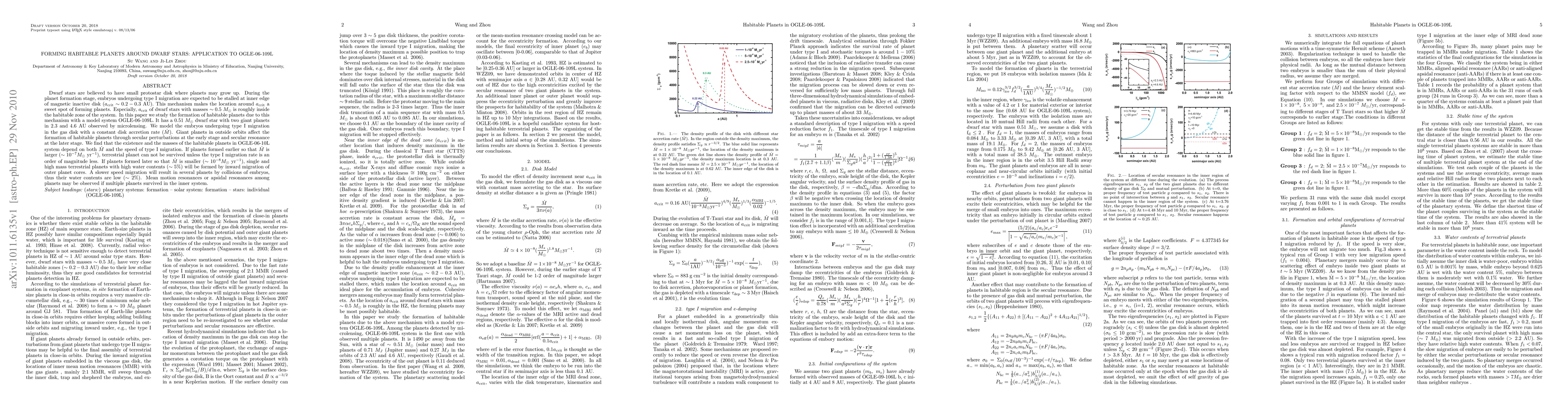 Dwarf stars are believed to have small protostar disk where planets may grow up. During the planet formation stage, embryos undergoing type I migration are expected to be stalled at inner edge of magnetic inactive disk ($a_{\rm crit} \sim 0.2-0.3 ~$AU). This mechanism makes the location around $a_{\rm crit}$ a sweet spot of forming planets. Especially, $a_{\rm crit}$ of dwarf stars with masses $\sim 0.5 M_\odot$ is roughly inside the habitable zone of the system. In this paper we study the formation of habitable planets due to this mechanism with a model system OGLE-06-109L. It has a $0.51 M_\odot$ dwarf star with two giant planets in 2.3 and 4.6 AU observed by microlensing. We model the embryos undergoing type I migration in the gas disk with a constant disk accretion rate ($\dot M$). Giant planets in outside orbits affect the formation of habitable planets through secular perturbations at the early stage and secular resonance at the later stage. We find that the existence and the masses of the habitable planets in OGLE-06-10L system depend on both $\dot M$ and the speed of type I migration. If planets formed earlier so that $\dot M$ is larger ($\sim 10^{-7} M_\odot $ yr$^{-1}$), terrestrial planet can not be survived unless the type I migration rate is an order of magnitude less. If planets formed later so that $\dot M$ is smaller ($\sim 10^{-8} M_\odot $ yr$^{-1}$), single and high mass terrestrial planets with high water contents ($\sim 5% $) will be formed by inward migration of outer planet cores. A slower speed migration will result in several planets by collisions of embryos, thus their water contents are low ($\sim 2%$). Mean motion resonances or apsidal resonances among planets may be observed if multiple planets survived in the inner system.
