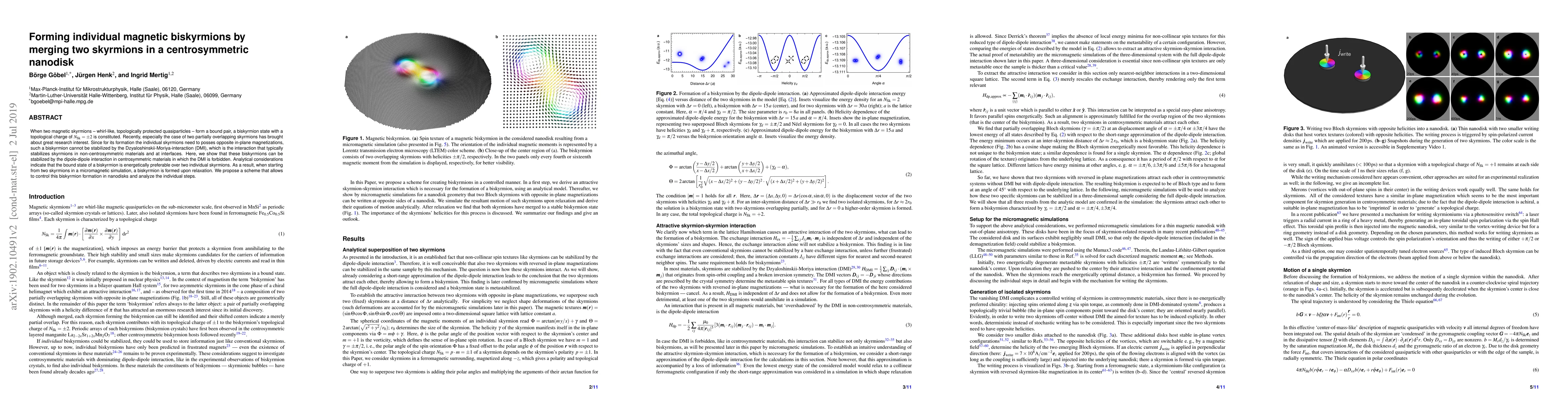 This paper demonstrates the formation of magnetic biskyrmions by merging two skyrmions in centrosymmetric nanodisks, stabilized by dipole-dipole interactions instead of the Dzyaloshinskii-Moriya interaction. The study shows that biskyrmions are energetically favorable and proposes a method to control their formation in nanodisks.