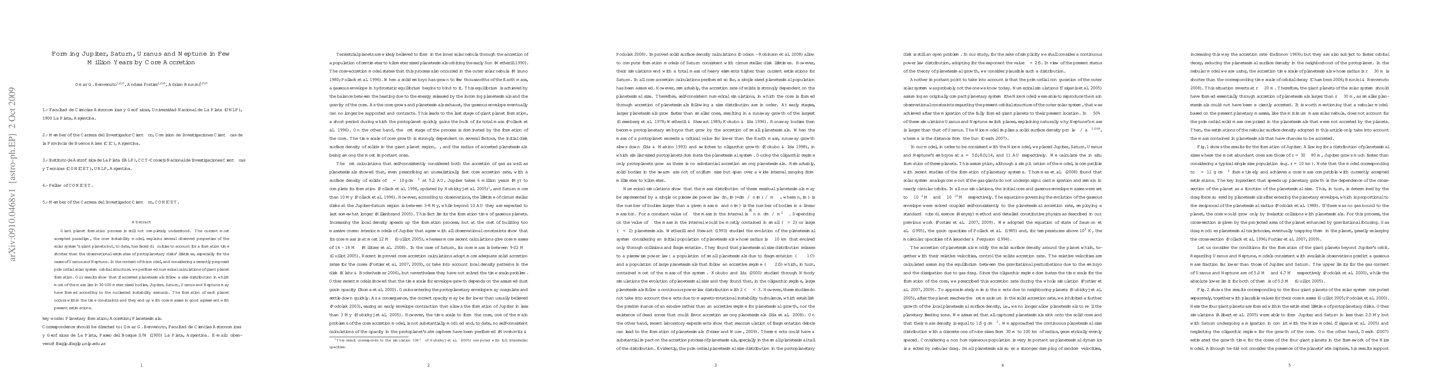 This paper proposes that Jupiter, Saturn, Uranus, and Neptune formed within a few million years via core accretion, using a size distribution of 30-100 meter planetesimals. This model aligns with the core instability paradigm and fits within the lifetime of protoplanetary disks, resolving previous formation time discrepancies.