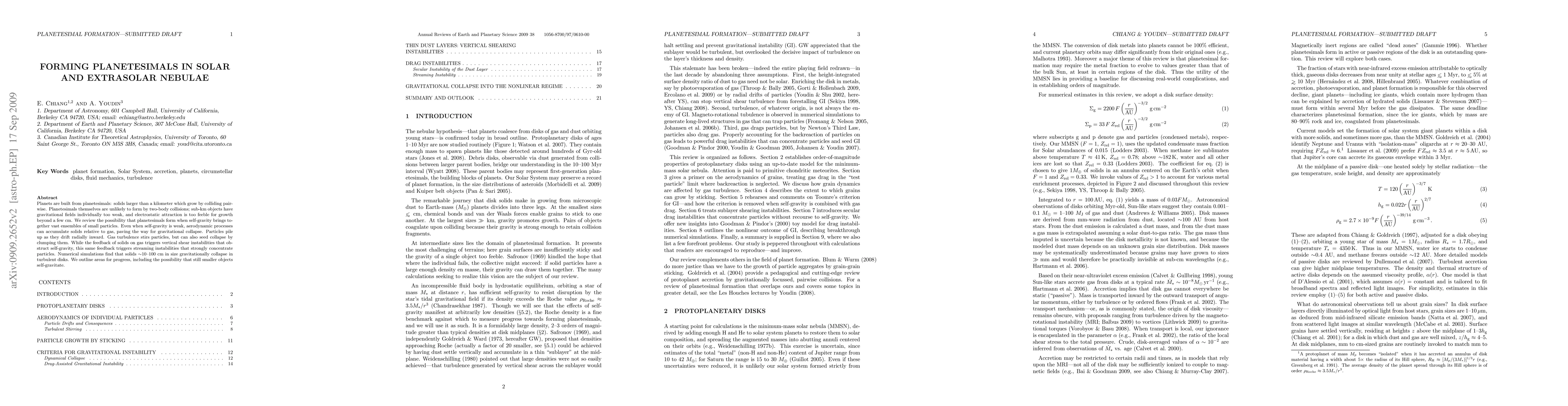 Planetesimals form when vast ensembles of small particles self-gravitate and accumulate, triggered by aerodynamic processes in turbulent disks. Numerical simulations show that solids 10-100 cm in size collapse under these conditions.
