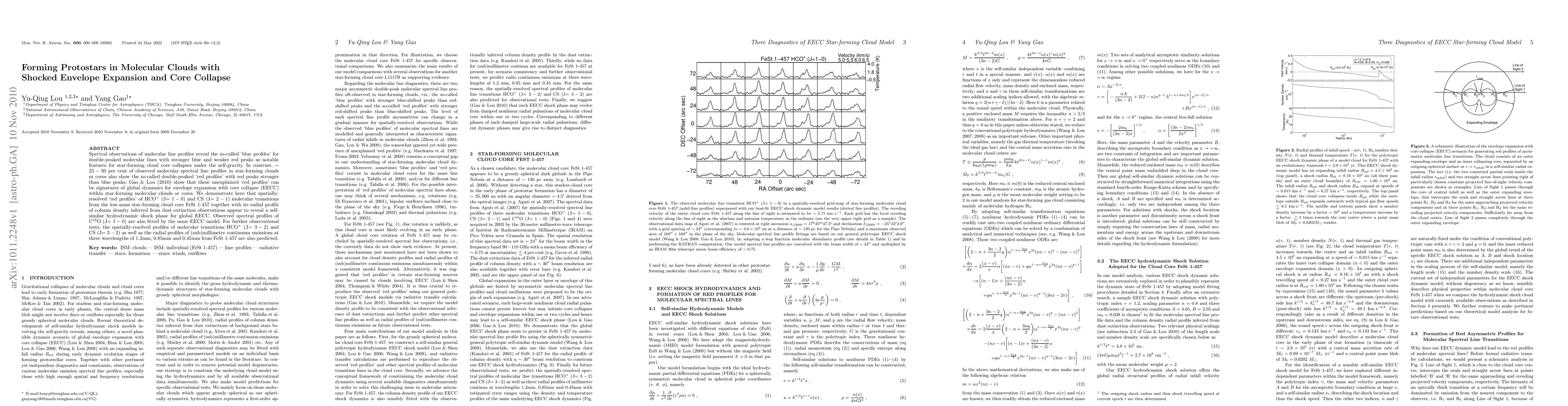 This paper investigates the dynamics of protostar formation in molecular clouds using spectral observations of molecular lines, revealing that "red profiles" indicate global dynamics of envelope expansion with core collapse (EECC). The study demonstrates that EECC processes in the low-mass star-forming cloud core FeSt 1-457 exhibit self-similar hydrodynamic shock phases, as evidenced by spatially-resolved molecular line profiles and dust extinction observations.