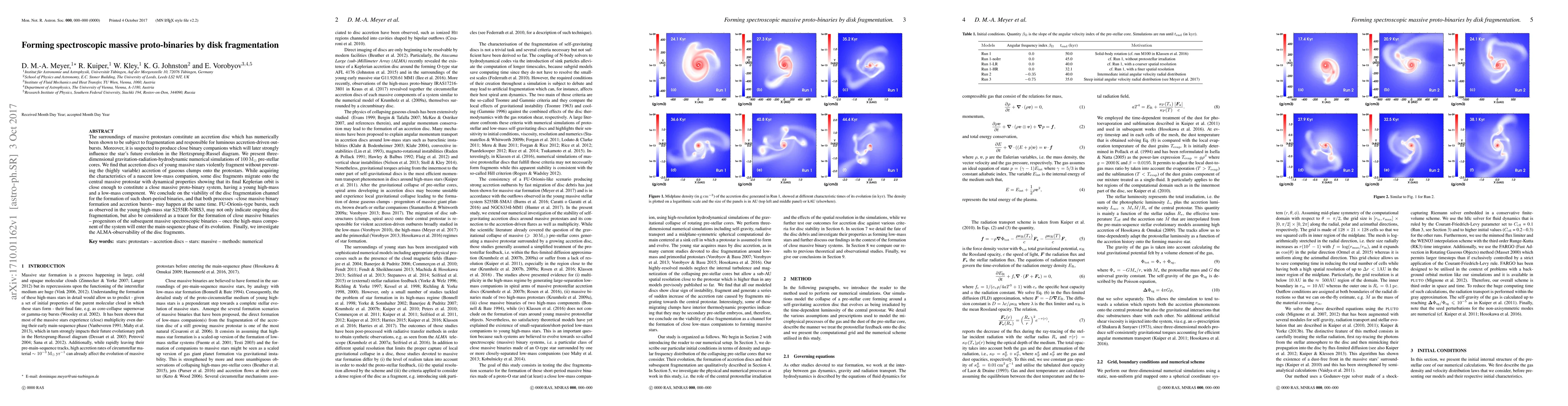 The surroundings of massive protostars constitute an accretion disc which has numerically been shown to be subject to fragmentation and responsible for luminous accretion-driven outbursts. Moreover, it is suspected to produce close binary companions which will later strongly influence the star's future evolution in the Hertzsprung-Russel diagram. We present three-dimensional gravitation-radiation-hydrodynamic numerical simulations of 100 Mo pre-stellar cores. We find that accretion discs of young massive stars violently fragment without preventing the (highly variable) accretion of gaseous clumps onto the protostars. While acquiring the characteristics of a nascent low-mass companion, some disc fragments migrate onto the central massive protostar with dynamical properties showing that its final Keplerian orbit is close enough to constitute a close massive proto-binary system, having a young high-mass and a low-mass component. We conclude on the viability of the disc fragmentation channel for the formation of such short-period binaries, and that both processes -close massive binary formation and accretion bursts- may happen at the same time. FU-Orionis-type bursts, such as observed in the young high-mass star S255IR-NIRS3, may not only indicate ongoing disc fragmentation, but also be considered as a tracer for the formation of close massive binaries - progenitors of the subsequent massive spectroscopic binaries - once the high-mass component of the system will enter the main-sequence phase of its evolution. Finally, we investigate the ALMA-observability of the disc fragments.