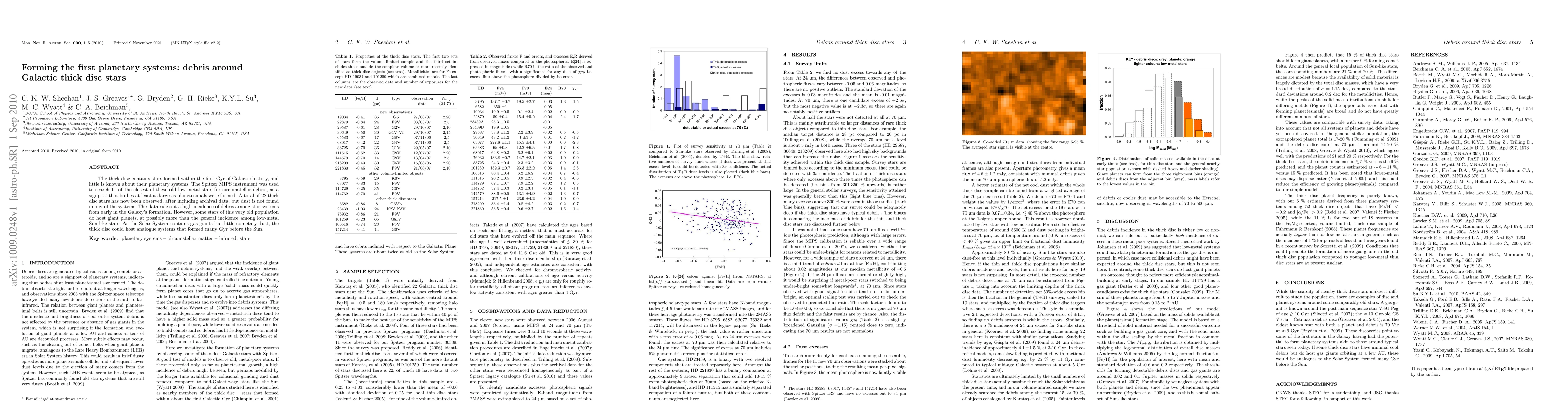 The thick disc contains stars formed within the first Gyr of Galactic history, and little is known about their planetary systems. The Spitzer MIPS instrument was used to search 11 of the closest of these old low-metal stars for circumstellar debris, as a signpost that bodies at least as large as planetesimals were formed. A total of 22 thick disc stars has now been observed, after including archival data, but dust is not found in any of the systems. The data rule out a high incidence of debris among star systems from early in the Galaxy's formation. However, some stars of this very old population do host giant planets, at possibly more than the general incidence among low-metal Sun-like stars. As the Solar System contains gas giants but little cometary dust, the thick disc could host analogue systems that formed many Gyr before the Sun.