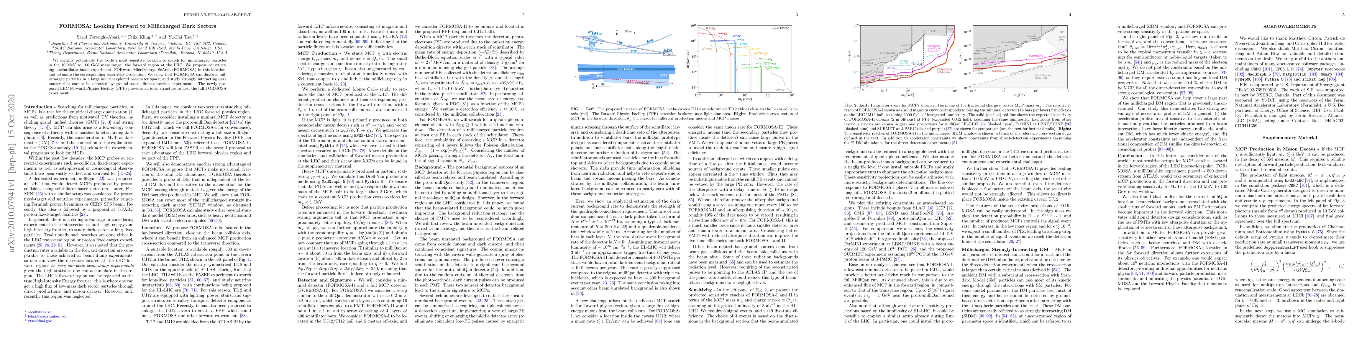 We identify potentially the world's most sensitive location to search for millicharged particles in the 10 MeV to 100 GeV mass range: the forward region at the LHC. We propose constructing a scintillator-based experiment, FORward MicrOcharge SeArch (FORMOSA) in this location, and estimate the corresponding sensitivity projection. We show that FORMOSA can discover millicharged particles in a large and unexplored parameter space, and study strongly interacting dark matter that cannot be detected by ground-based direct-detection experiments. The newly proposed LHC Forward Physics Facility (FPF) provides an ideal structure to host the full FORMOSA experiment.