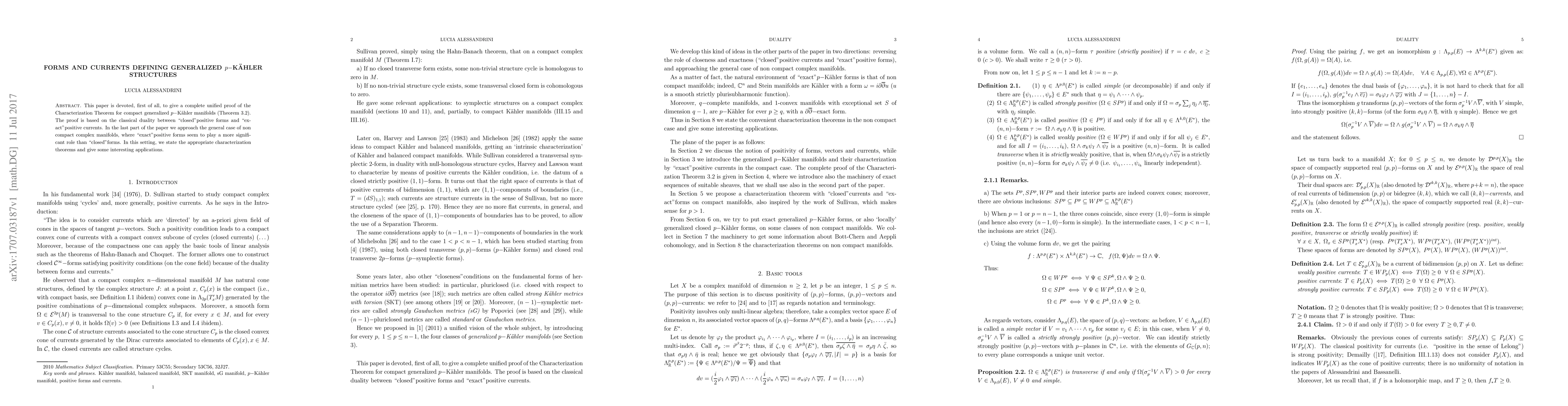 This paper is devoted, first of all, to give a complete unified proof of the Characterization Theorem for compact generalized $p-$K\"ahler manifolds (Theorem 3.2). The proof is based on the classical duality between "closed" positive forms and "exact" positive currents. In the last part of the paper we approach the general case of non compact complex manifolds, where "exact" positive forms seem to play a more significant role than "closed" forms. In this setting, we state the appropriate characterization theorems and give some interesting applications.
