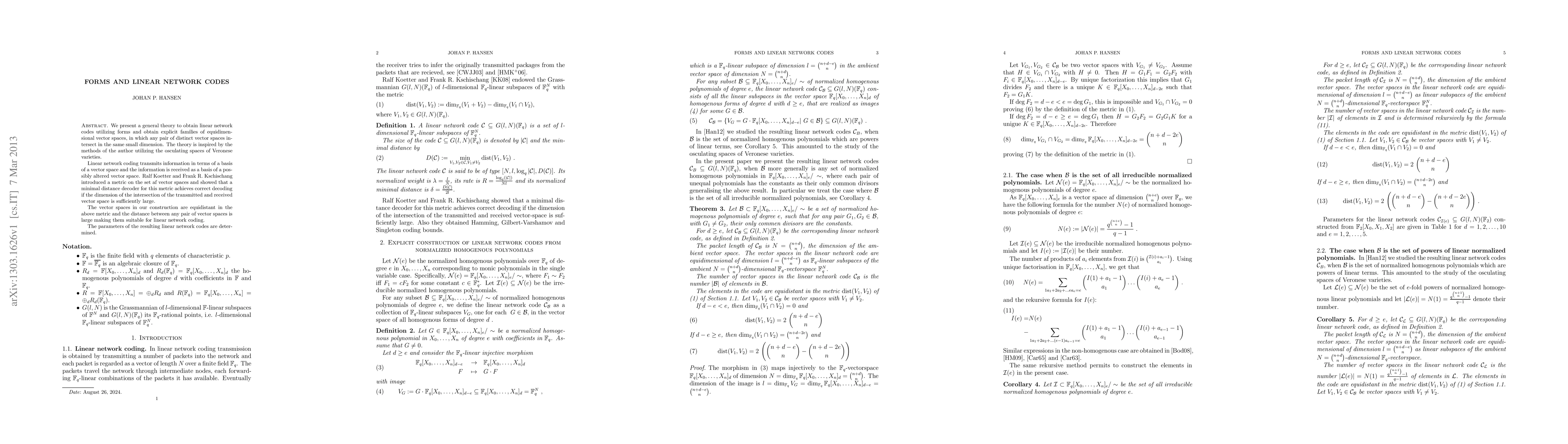 We present a general theory to obtain linear network codes utilizing forms and obtain explicit families of equidimensional vector spaces, in which any pair of distinct vector spaces intersect in the same small dimension. The theory is inspired by the methods of the author utilizing the osculating spaces of Veronese varieties. Linear network coding transmits information in terms of a basis of a vector space and the information is received as a basis of a possibly altered vector space. Ralf Koetter and Frank R. Kschischang introduced a metric on the set af vector spaces and showed that a minimal distance decoder for this metric achieves correct decoding if the dimension of the intersection of the transmitted and received vector space is sufficiently large. The vector spaces in our construction are equidistant in the above metric and the distance between any pair of vector spaces is large making them suitable for linear network coding. The parameters of the resulting linear network codes are determined.