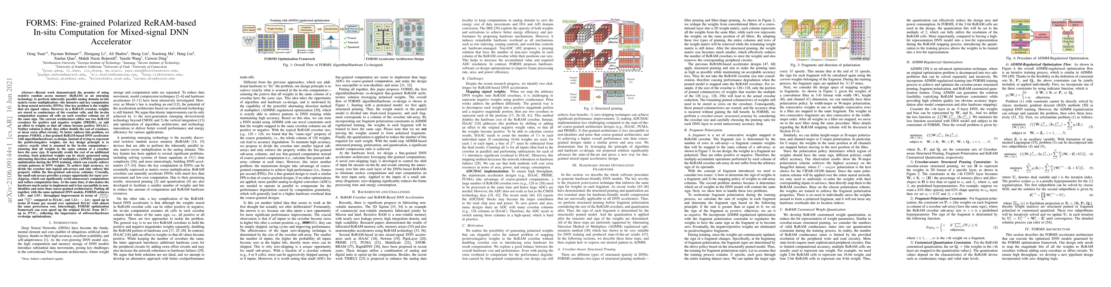This paper introduces FORMS, a fine-grained ReRAM-based DNN accelerator that addresses the challenge of representing both positive and negative weights in in-situ computation. It achieves this by ensuring all weights in the same crossbar column have the same sign, avoiding the need for additional crossbars or offset circuitry, and utilizes ADMM optimization for weight generation.