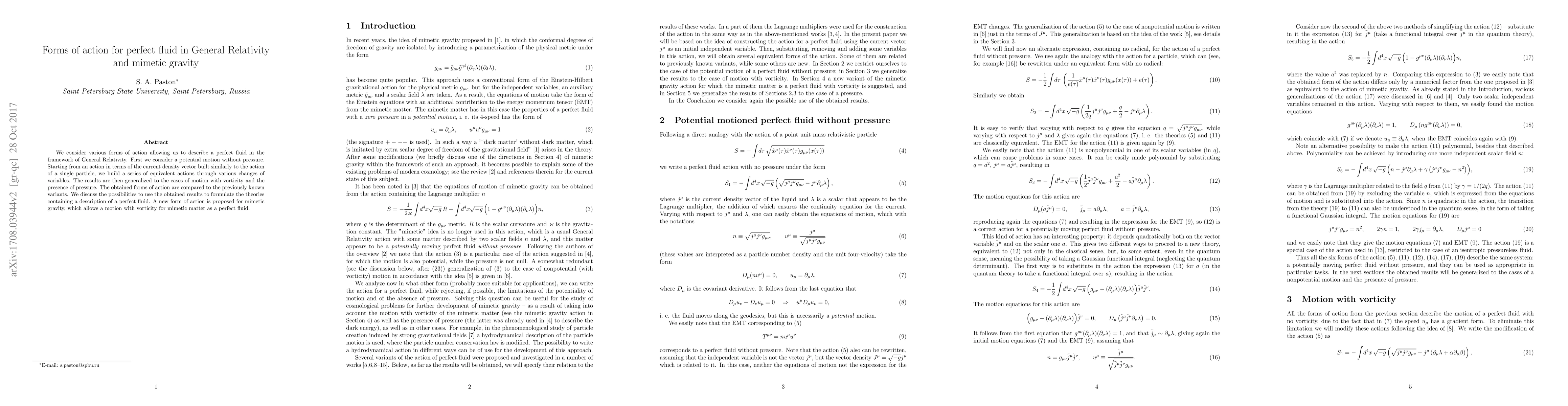 We consider various forms of action allowing us to describe a perfect fluid in the framework of General Relativity. First we consider a potential motion without pressure. Starting from an action in terms of the current density vector built similarly to the action of a single particle, we build a series of equivalent actions through various changes of variables. The results are then generalized to the cases of motion with vorticity and the presence of pressure. The obtained forms of action are compared to the previously known variants. We discuss the possibilities to use the obtained results to formulate the theories containing a description of a perfect fluid. A new form of action is proposed for mimetic gravity, which allows a motion with vorticity for mimetic matter as a perfect fluid.