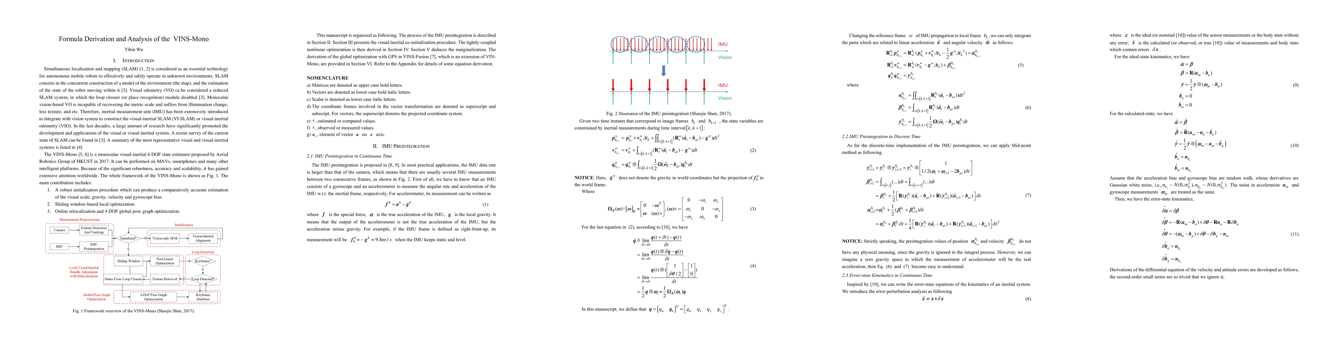The VINS-Mono is a monocular visual-inertial 6 DOF state estimator proposed by Aerial Robotics Group of HKUST in 2017. It can be performed on MAVs, smartphones and many other intelligent platforms. Because of the excellent robustness, accuracy and scalability, it has gained extensive attention worldwide. In this manuscript, the main equations including IMU pre-integration, visual-inertial co-initialization and tightly-coupled nonlinear optimization are derived and analyzed.