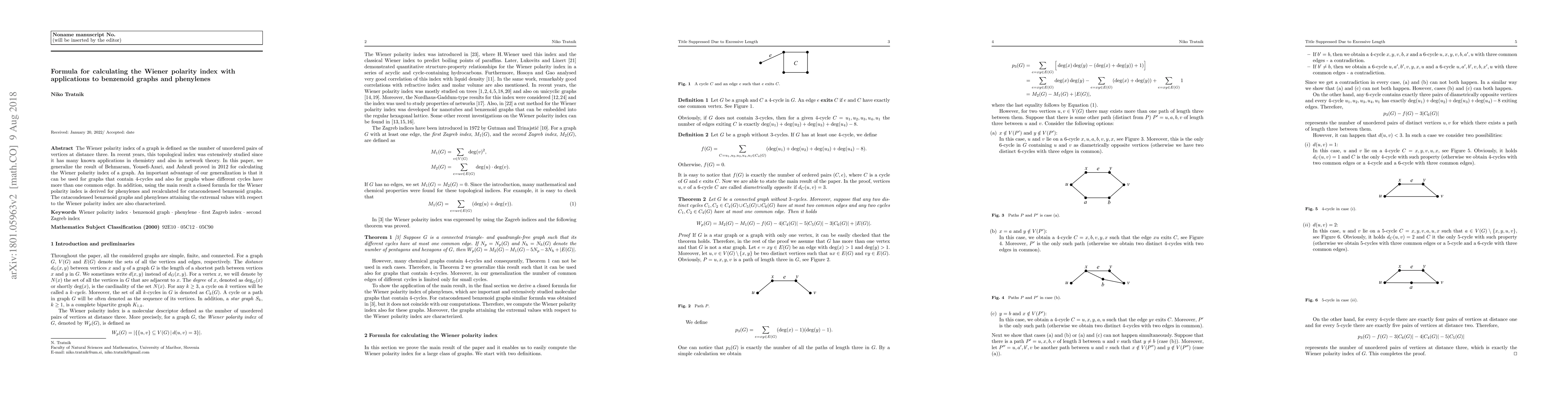 The Wiener polarity index of a graph is defined as the number of unordered pairs of vertices at distance three. In recent years, this topological index was extensively studied since it has many known applications in chemistry and also in network theory. In this paper, we generalize the result of Behmaram, Yousefi-Azari, and Ashrafi proved in 2012 for calculating the Wiener polarity index of a graph. An important advantage of our generalization is that it can be used for graphs that contain $4$-cycles and also for graphs whose different cycles have more than one common edge. In addition, using the main result a closed formula for the Wiener polarity index is derived for phenylenes and recalculated for catacondensed benzenoid graphs. The catacondensed benzenoid graphs and phenylenes attaining the extremal values with respect to the Wiener polarity index are also characterized.