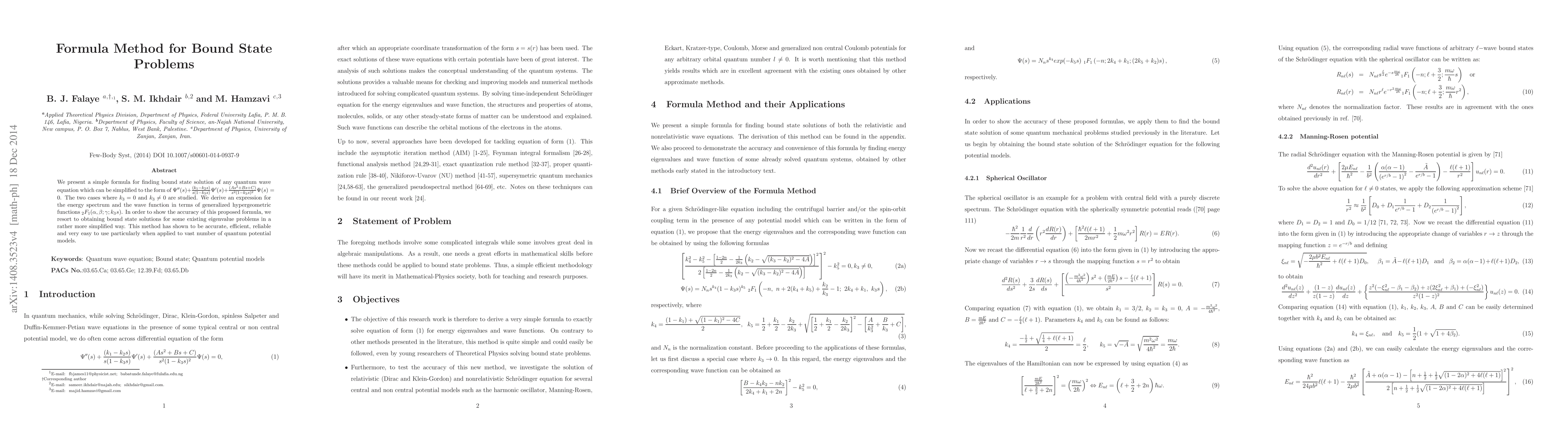 We present a simple formula for finding bound state solution of any quantum wave equation which can be simplified to the form of $\Psi"(s)+\frac{(k_1-k_2s)}{s(1-k_3s)}\Psi'(s)+\frac{(As^2+Bs+C)}{s^2(1-k_3s)^2}\Psi(s)=0$. The two cases where $k_3=0$ and $k_3\neq 0$ are studied. We derive an expression for the energy spectrum and the wave function in terms of generalized hypergeometric functions $_2F_1(\alpha, \beta; \gamma; k_3s)$. In order to show the accuracy of this proposed formula, we resort to obtaining bound state solutions for some existing eigenvalue problems in a rather more simplified way. This method has been shown to be accurate, efficient, reliable and very easy to use particularly when applied to vast number of quantum potential models.