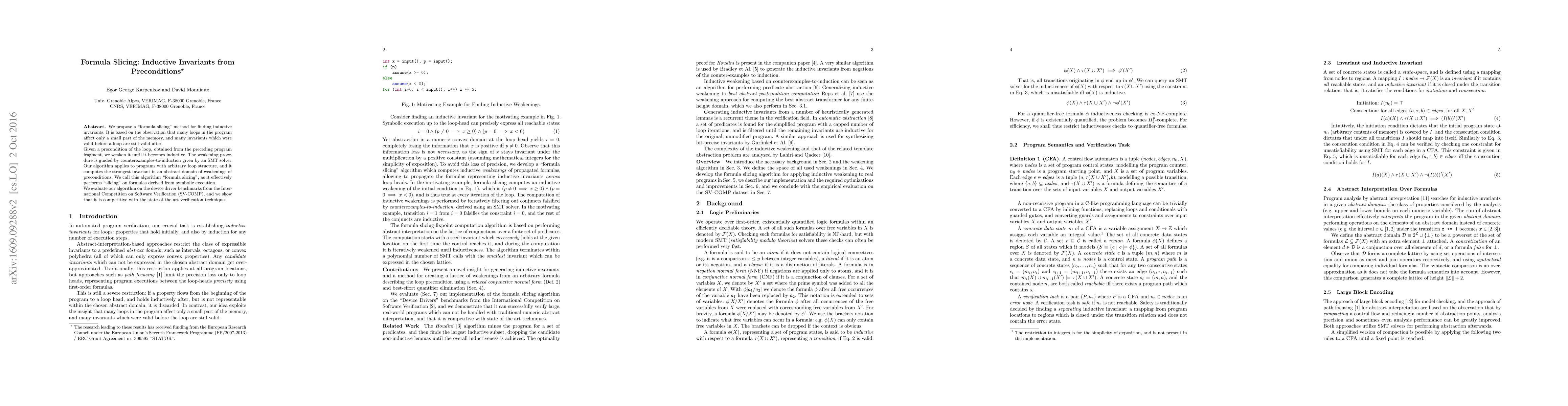 We propose a "formula slicing" method for finding inductive invariants. It is based on the observation that many loops in the program affect only a small part of the memory, and many invariants which were valid before a loop are still valid after. Given a precondition of the loop, obtained from the preceding program fragment, we weaken it until it becomes inductive. The weakening procedure is guided by counterexamples-to-induction given by an SMT solver. Our algorithm applies to programs with arbitrary loop structure, and it computes the strongest invariant in an abstract domain of weakenings of preconditions. We call this algorithm "formula slicing", as it effectively performs "slicing" on formulas derived from symbolic execution. We evaluate our algorithm on the device driver benchmarks from the International Competition on Software Verification (SV-COMP), and we show that it is competitive with the state-of-the-art verification techniques.