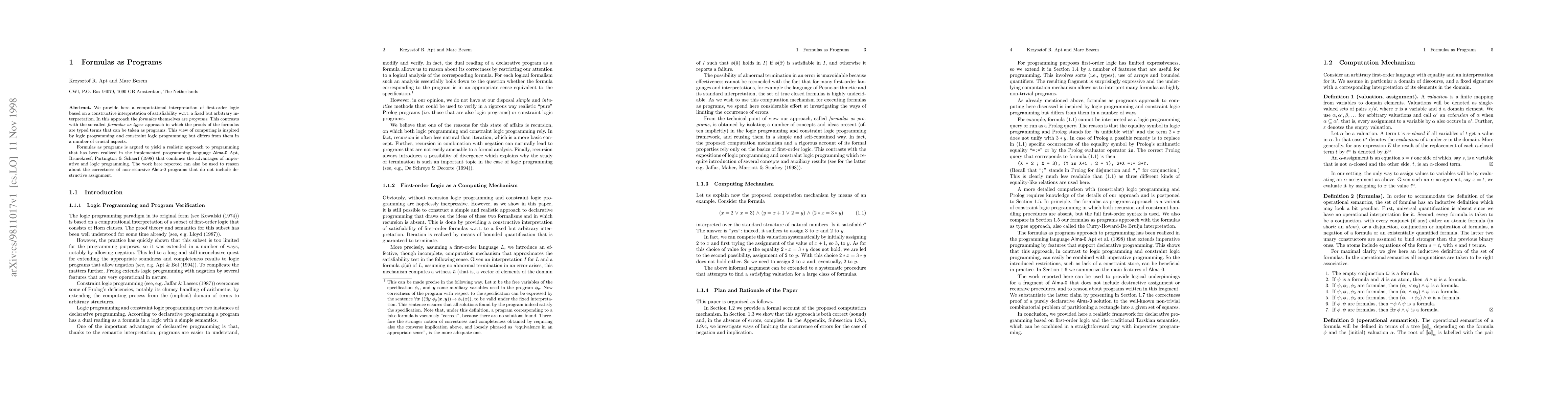 The paper presents a computational interpretation of first-order logic where formulas themselves are programs, inspired by logic and constraint programming but differing in crucial aspects.