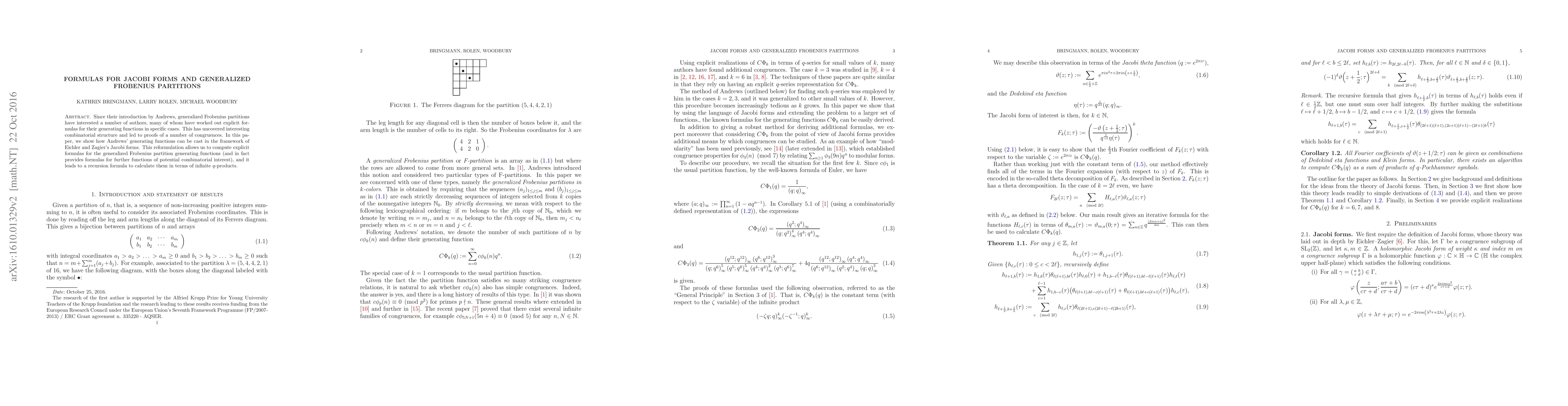 Since their introduction by Andrews, generalized Frobenius partitions have interested a number of authors, many of whom have worked out explicit formulas for their generating functions in specific cases. This has uncovered interesting combinatorial structure and led to proofs of a number of congruences. In this paper, we show how Andrews' generating functions can be cast in the framework of Eichler and Zagier's Jacobi forms. This reformulation allows us to compute explicit formulas for the generalized Frobenius partition generating functions (and in fact provides formulas for further functions of potential combinatorial interest), and it leads to a recursion formula to calculate them in terms of infinite $q$-products.