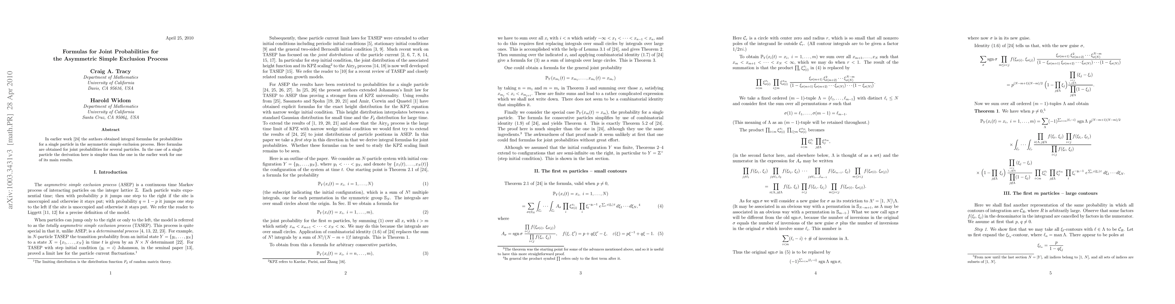 This paper provides integral formulas for joint probabilities in the asymmetric simple exclusion process involving multiple particles, simplifying the derivation for a key result compared to previous work on single-particle probabilities.