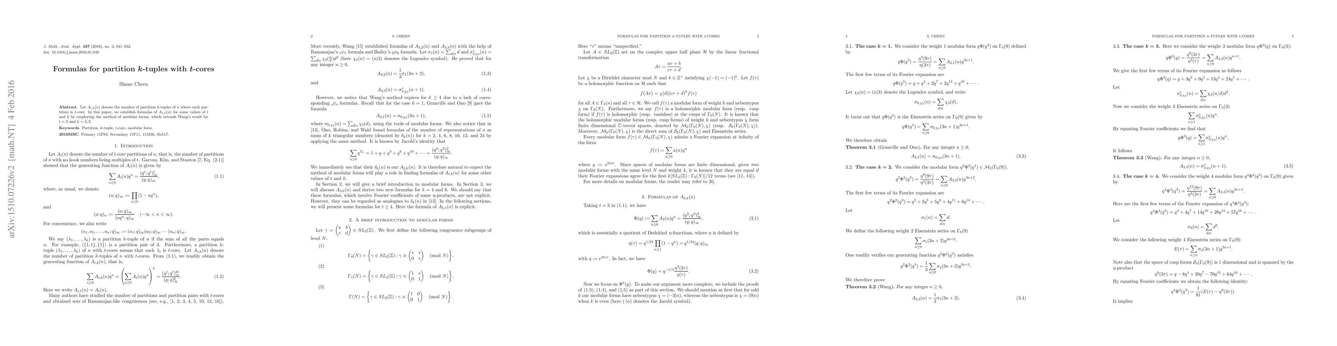 This paper establishes formulas for partition k-tuples with t-cores using modular forms, expanding on Wang's result to new values of t and k. It focuses on providing solutions for specific values of t and k.