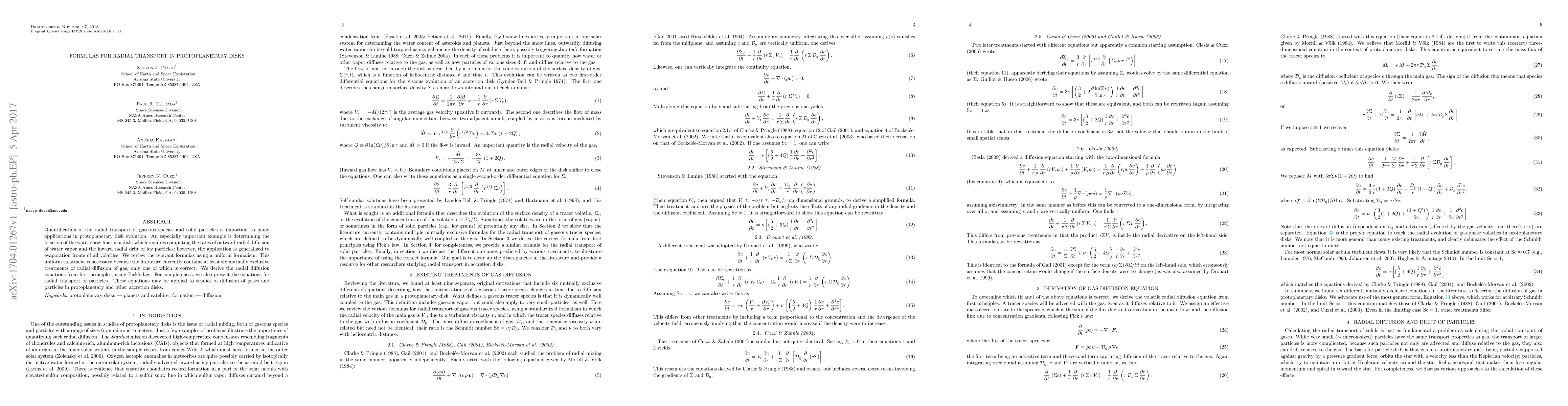 This paper reviews and derives uniform formulas for radial transport of gaseous species and solid particles in protoplanetary disks, addressing the discrepancies in existing literature. It provides accurate equations for radial diffusion of gas and particle drift, applicable to studies of disk evolution and the location of water snow lines.