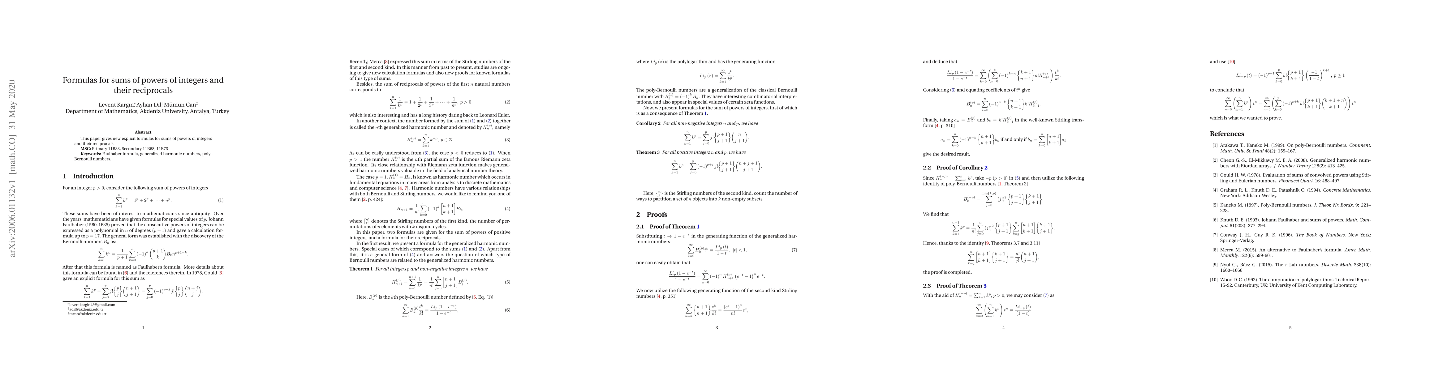 This paper gives new explicit formulas for sums of powers of integers and their reciprocals.