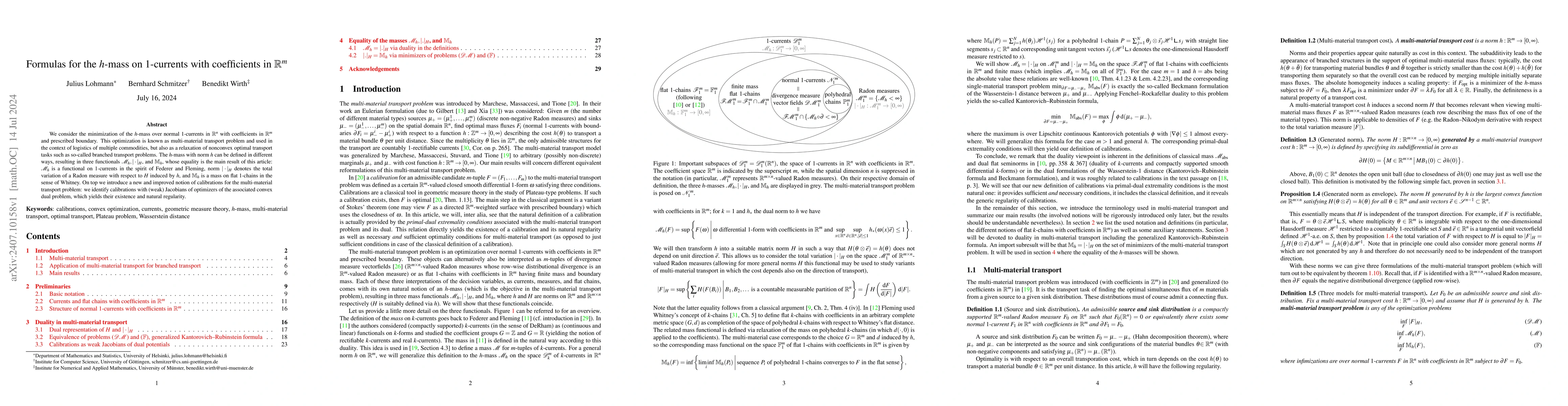 We consider the minimization of the $h$-mass over normal $1$-currents in $\mathbb{R}^n$ with coefficients in $\mathbb{R}^m$ and prescribed boundary. This optimization is known as multi-material transport problem and used in the context of logistics of multiple commodities, but also as a relaxation of nonconvex optimal transport tasks such as so-called branched transport problems. The $h$-mass with norm $h$ can be defined in different ways, resulting in three functionals $\mathcal{M}_h,|\cdot|_H$, and $\mathbb{M}_h$, whose equality is the main result of this article: $\mathcal{M}_h$ is a functional on $1$-currents in the spirit of Federer and Fleming, norm $|\cdot|_H$ denotes the total variation of a Radon measure with respect to $H$ induced by $h$, and $\mathbb{M}_h$ is a mass on flat $1$-chains in the sense of Whitney. On top we introduce a new and improved notion of calibrations for the multi-material transport problem: we identify calibrations with (weak) Jacobians of optimizers of the associated convex dual problem, which yields their existence and natural regularity.