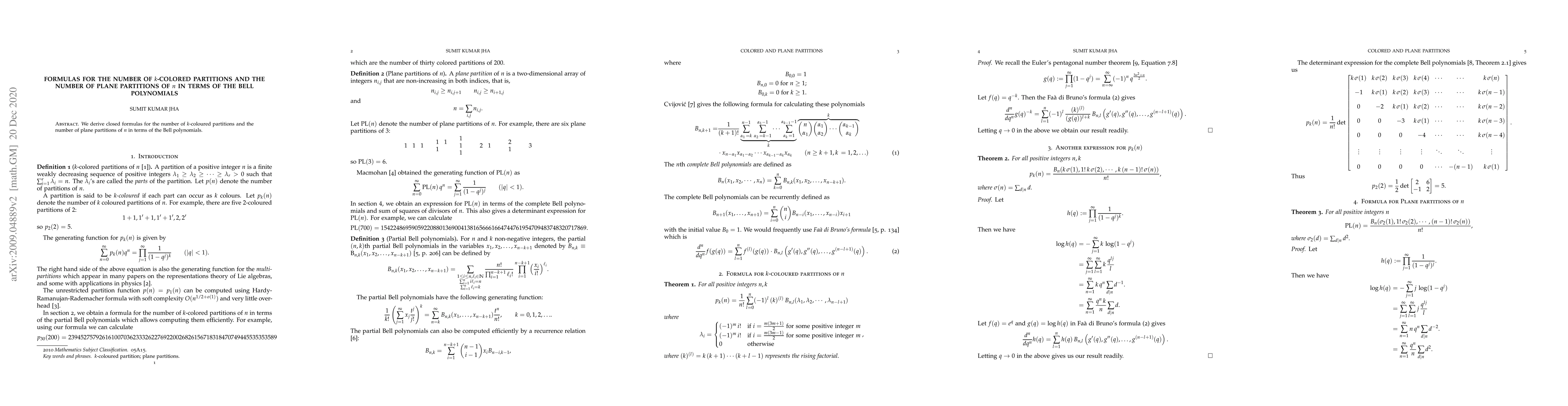 This paper provides closed formulas for counting $k$-colored partitions and plane partitions of $n$ using Bell polynomials, offering a new mathematical perspective on these combinatorial structures. The results enhance the understanding of partition theory through the lens of Bell polynomials.