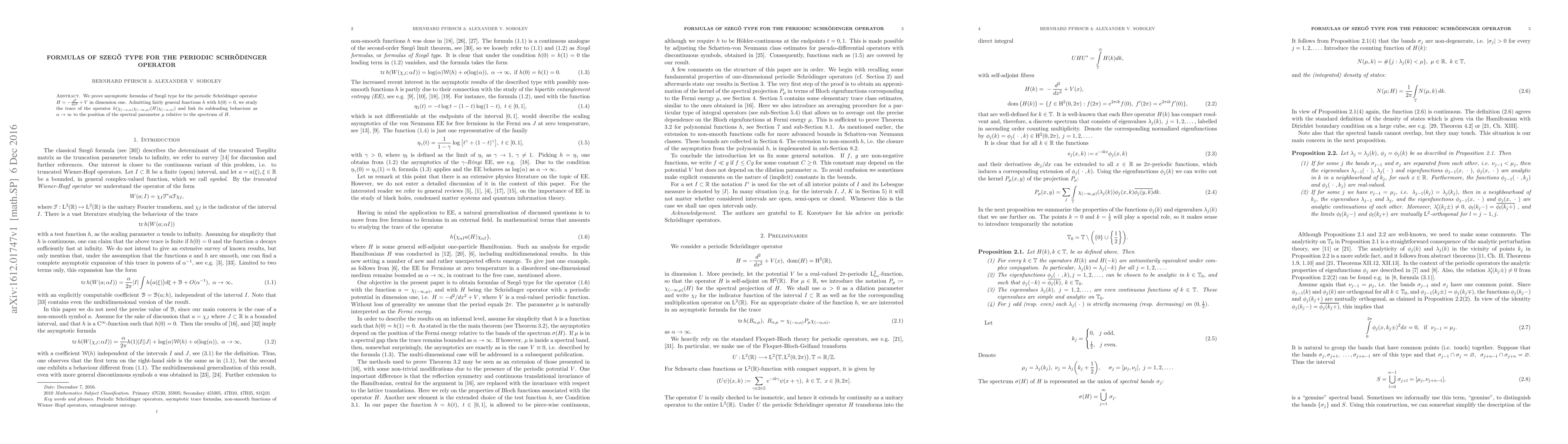 This paper proves Szegő-type asymptotic formulas for the periodic Schrödinger operator in one dimension, linking the subleading behavior of the trace of a modified operator to the position of the spectral parameter relative to the operator's spectrum. The analysis accommodates a wide range of functions with specific initial conditions.