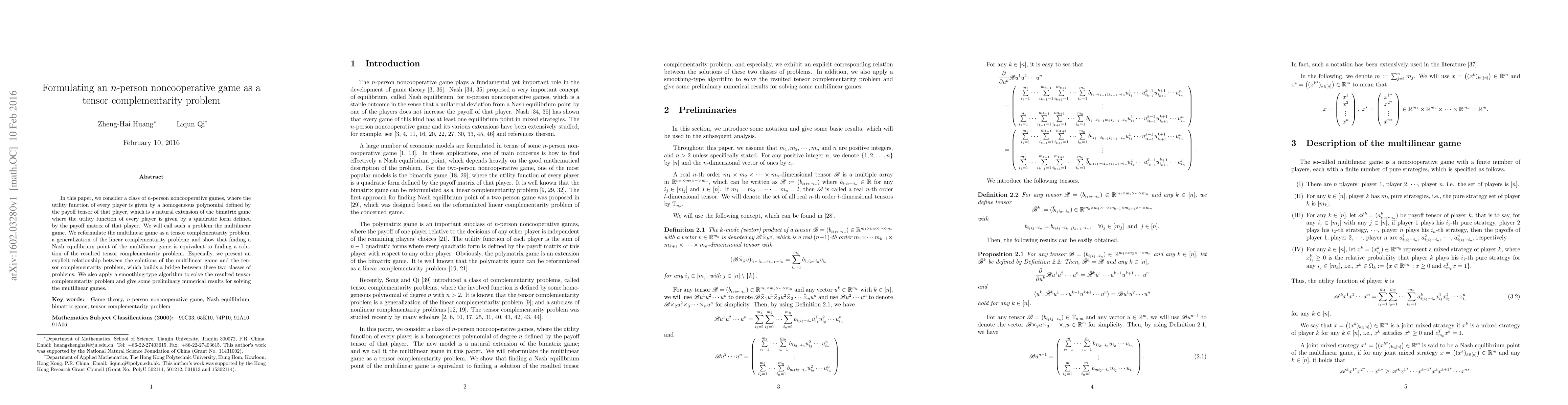 In this paper, we consider a class of $n$-person noncooperative games, where the utility function of every player is given by a homogeneous polynomial defined by the payoff tensor of that player, which is a natural extension of the bimatrix game where the utility function of every player is given by a quadratic form defined by the payoff matrix of that player. We will call such a problem the multilinear game. We reformulate the multilinear game as a tensor complementarity problem, a generalization of the linear complementarity problem; and show that finding a Nash equilibrium point of the multilinear game is equivalent to finding a solution of the resulted tensor complementarity problem. Especially, we present an explicit relationship between the solutions of the multilinear game and the tensor complementarity problem, which builds a bridge between these two classes of problems. We also apply a smoothing-type algorithm to solve the resulted tensor complementarity problem and give some preliminary numerical results for solving the multilinear games.