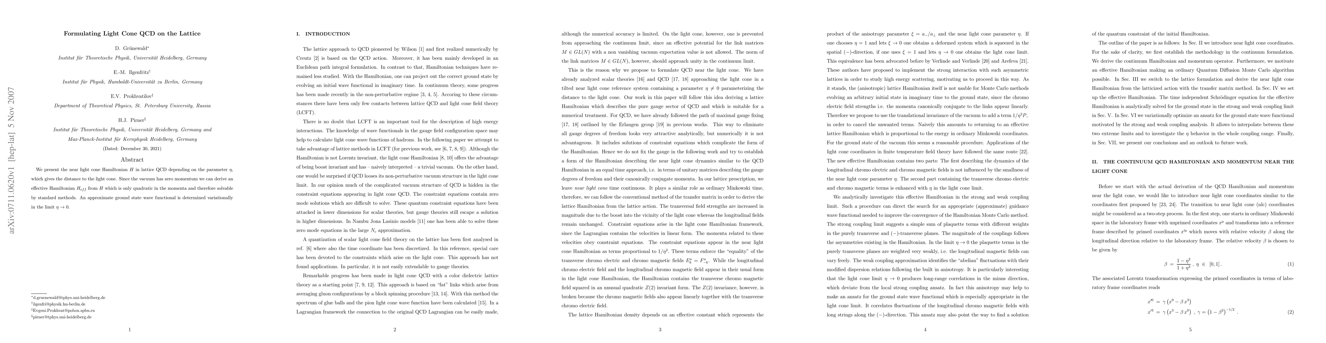 We present the near light cone Hamiltonian $H$ in lattice QCD depending on the parameter $\eta$, which gives the distance to the light cone. Since the vacuum has zero momentum we can derive an effective Hamiltonian $H_{eff}$ from $H$ which is only quadratic in the momenta and therefore solvable by standard methods. An approximate ground state wave functional is determined variationally in the limit $\eta \to 0$.