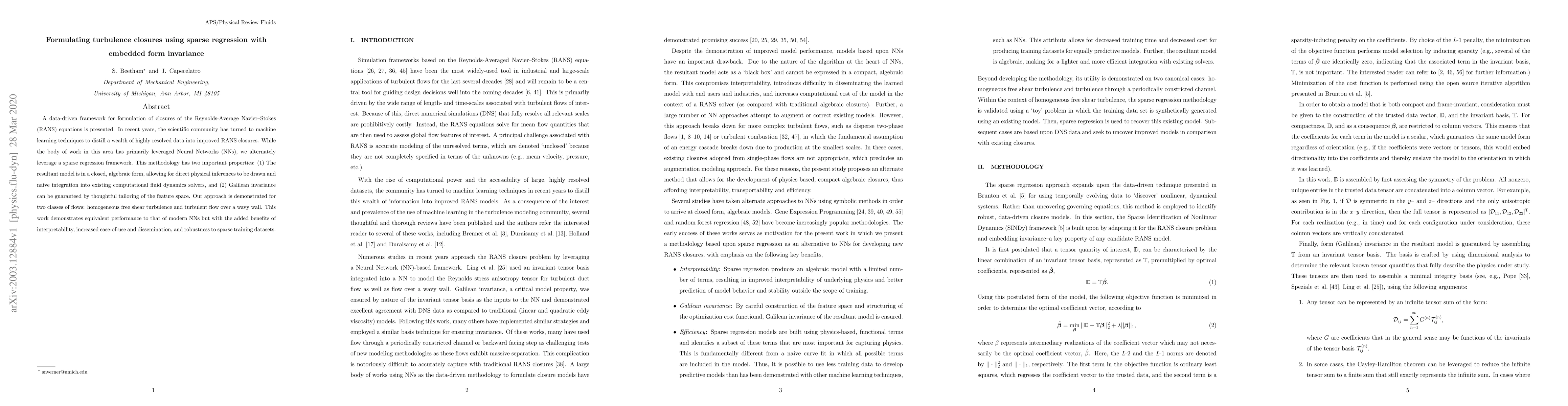 This paper introduces a data-driven method using sparse regression to formulate turbulence closures for Reynolds-Average Navier-Stokes equations. The approach offers benefits such as a closed algebraic model for physical inferences, easy integration into existing CFD solvers, and guaranteed Galilean invariance. It demonstrates performance comparable to neural networks, with added advantages of interpretability, ease-of-use, and robustness to sparse datasets.