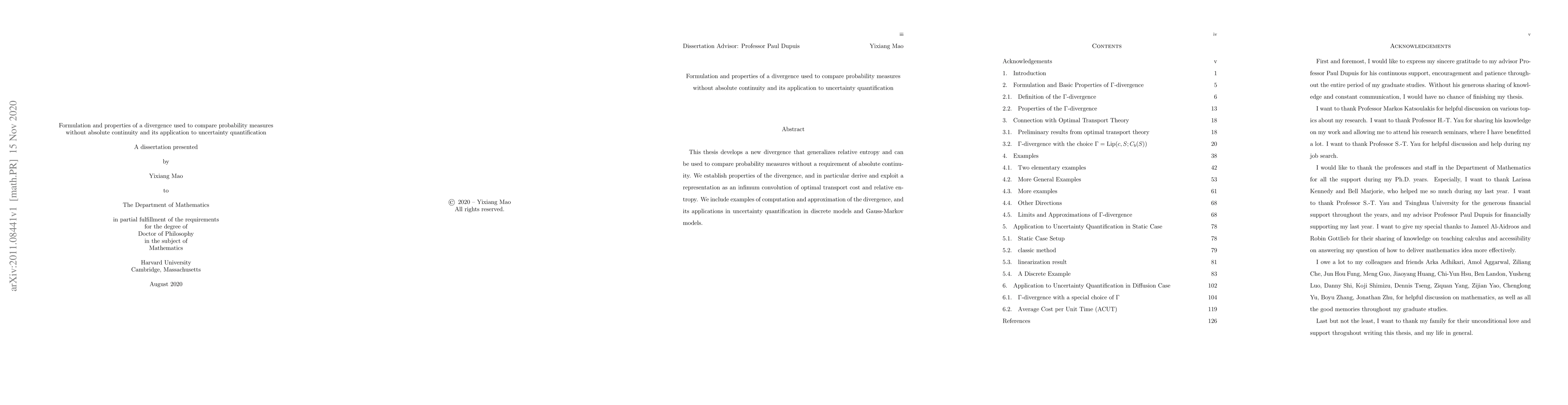 This thesis develops a new divergence that generalizes relative entropy and can be used to compare probability measures without a requirement of absolute continuity. We establish properties of the divergence, and in particular derive and exploit a representation as an infimum convolution of optimal transport cost and relative entropy. We include examples of computation and approximation of the divergence, and its applications in uncertainty quantification in discrete models and Gauss-Markov models.